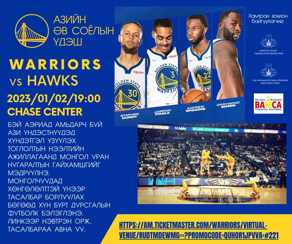 “Golden State Warriors” жил бүр Бэй Аэриад амьдардаг Ази гаралтай иргэдэд хүндэтгэл үзүүлэх зорилгоор “Азийн өв соёлын үдэш” зохион байгуулдаг юм байна. Ирэх жил ийнхүү монголчууд маань энэ үдшийг өнгөлөх боломж тохиолоо.
