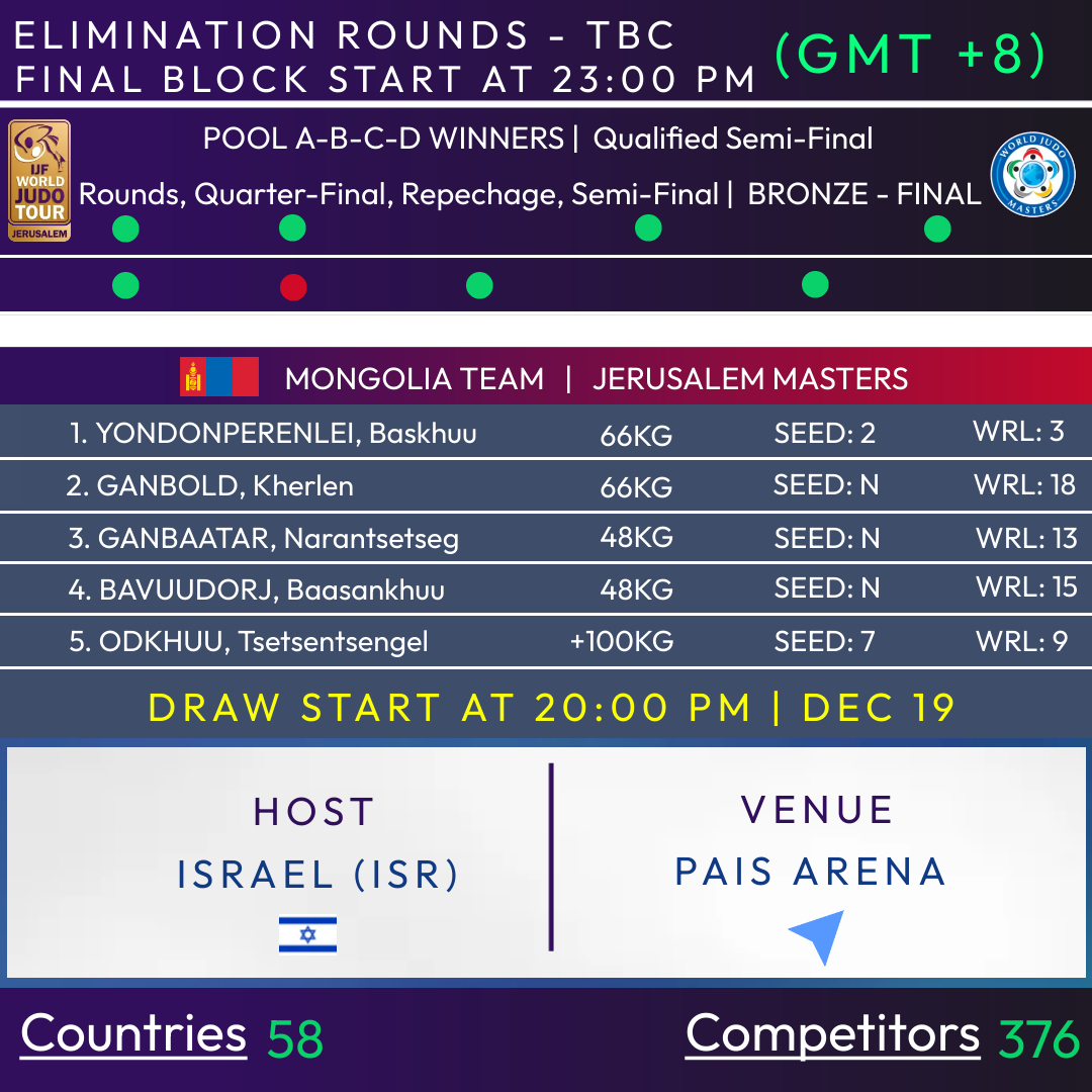 Манай улсаас Израилийн татамид эрэгтэй ес, эмэгтэй таван, нийт 14 жүдоч барилдах мэдээлэг өгсөн байсан. Харин эцсийн мэдүүлгээр манай улсаас таван тамирчин оролцохоор мэдүүлэгт өөрчлөлт орлоо. Эрэгтэйчүүдийн 66 кг-ын жинд дэлхийн аваргын хүрэл медальт, Ази тивийн аварга, ОУХМ Ё.Басхүү, ОУХМ Г.Хэрлэн, +100 кг-ын жинд ОУХМ О.Цэцэнцэнгэл, эмэгтэйчүүдийн 48 кг-ын жинд ОУХМ Г.Наранцэцэг, ОУХМ Б.Баасанхүү нар барилдахаар болжээ.