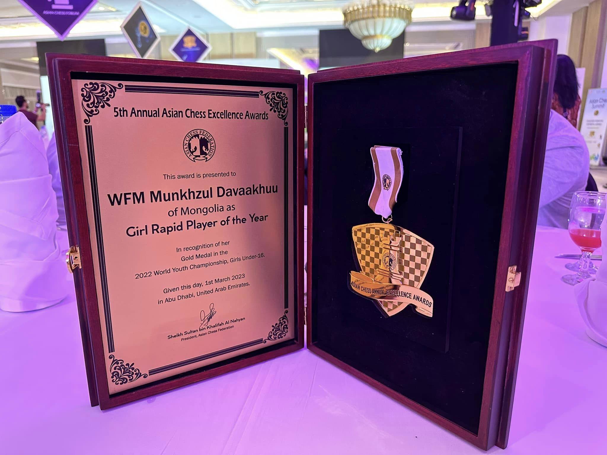 Өсвөрийн шатарчдын дэлхийн хошой аварга, Олон улсын шатрын холбооны мастер Даваахүүгийн Мөнхзул Ази тивийн оны “ШИЛДЭГ ӨСВӨРИЙН РАПИД ШАТАРЧИН” номинацийн эзнээр шалгарсан байна. “WFM” Д.Мөнхзул "Гэгээн арвай" клубийн тамирчин аж. Түүний дасгалжуулагчаар их мастер Б.Гүндаваа ажиллаж байгаа ажээ.