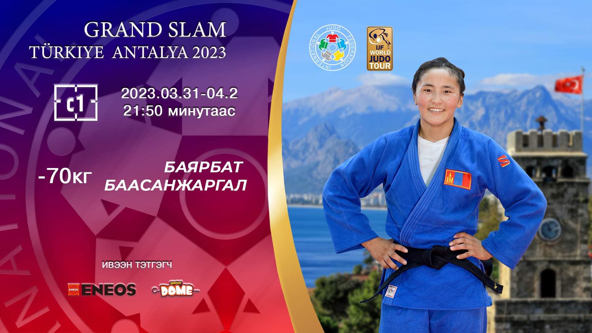 Туркийн Анаталья “Гранд слам” тэмцээний хоёр дахь өдрийн барилдаан явагдаж байна. Эмэгтэйчүүдийн 70 кг-ын жинд 44 бөх барилдаж байгаа. Манай залуу тамирчин Баярбатын Баасанжаргал “В” хэсгийн эхний тойрогт Словенийн Anka Pogacnik-т ялагдаж тэмцээнээ өндөрлөв. Тус жингийн “С” хэсэгт Б.Ням-Эрдэнэ эхний тойргийн барилдаанд гоц мөргөн ялалт аваад байгаа. Тэрбээр хоёрдугаар тойргийн барилдаанд Узбекистаны Khurshinda Razzokberdieva-тай таарсан. Түүнийг ялах юм бол гуравдугаар тойрогт Австрийн Michaela Polleres-той барилдана.