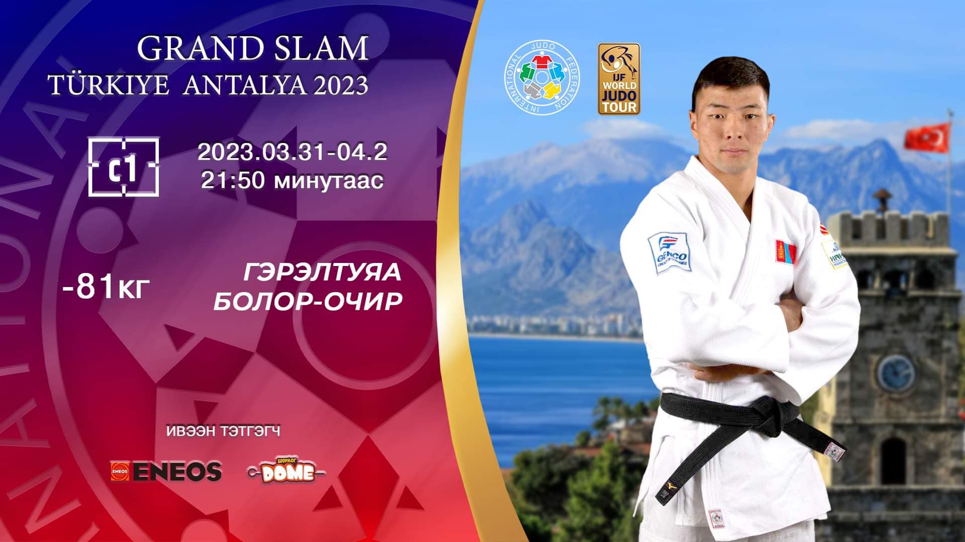 Туркийн Анаталья “Гранд слам” тэмцээний хоёр дахь өдрийн барилдаан үргэлжилж байна. Эрэгтэйчүүдийн 81 кг-ын жинд 57 бөх барилдаж байна. Манай залуу тамирчин Гэрэлтуяагийн Болор-Очир эхний тойрогт Испанийн тамирчин Alfonso Solana Urquiza-г яллаа. Тэрбээр хоёрдугаар тойргийн барилдаанд Английн Lachlan Moorheard-ийг буулган авлаа. Гуравдугаар тойрогт Азербайжаны нэрийн өмнөөс барилдаж буй дэлхийн аварга, олимпын мөнгөн медальт Сайд Моллайтай барилдана. Хэрэв Моллай аваргыг ялж чадвал "С" хэсгийн аваргын төлөө Нидерландын Frank De Wit-тэй барилдах юм.