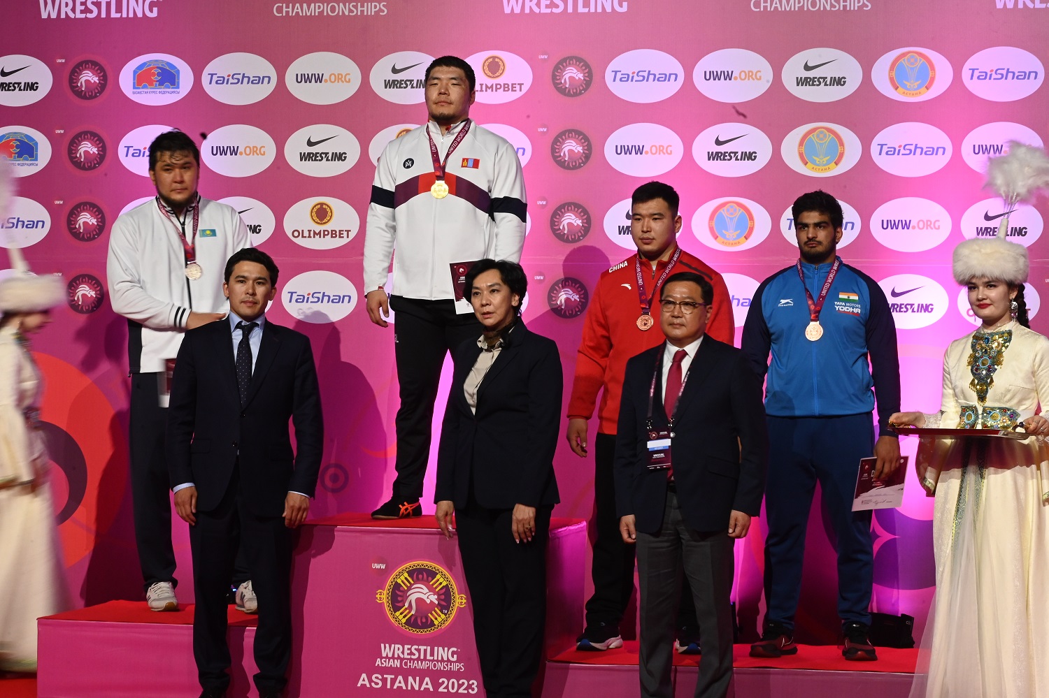 “Белград-2022” ДАШТ-ий мөнгө, “Осло-2021” ДАШТ-ий хүрэл медальт, гавьяат тамирчин Мөнхтөрийн Лхагвагэрэл Астанагийн дэвжээнд 125 кг-ын жинд алтан медаль хүртэж Монгол Улсын алтан соёмбот далбаагаа мандуулж, төрийн дууллаа эгшиглүүлэв. Тэрбээр шигшээ барилдаанд өмнө нь гурван удаа барилдахдаа нэг ялж, хоёр удаа ялагдаж байсан “U23” ангиллын ДАШТ-ий хүрэл медальт, насанд хүрэгчдийн Азийн аварга, эзэн орны бөх Юсуп Батырмурзаевыг нутгийн дэвжээн дээр нь хөгжөөн дэмжигчдийнх нь өмнө нь 1:1-ээр сүүлийн оноогоор ялснаар Монголын эрэгтэй бөхчүүдээс Азийн аваргаас 16 дахь алтан медалийг найман жилийн дараа эх орондоо авчирлаа. Эрэгтэйчүүдийн хамгийн хүнд жин 125 кг-д хамгийн сүүлд 2001 онд гавьяат тамирчин, дархан аварга Г.Өсөхбаяр Азийн аварга болж байжээ. Харин М.Лхагвагэрэл ийнхүү 22 жилийн дараа Азийн аваргад түрүүлж, алтан медаль хүртлээ.