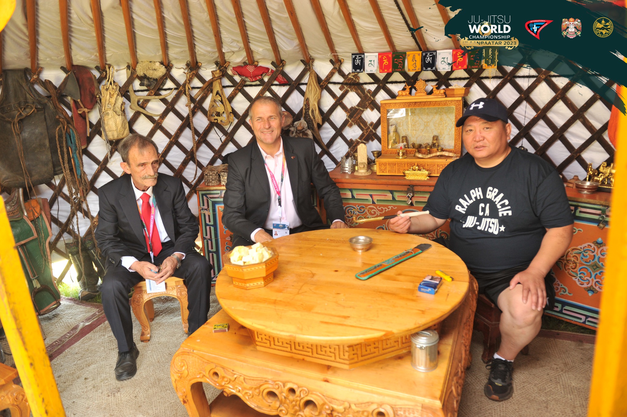 Олон улсын жюү жүцүгийн холбоо (JJIF)-ны ерөнхийлөгч Грек Улсын иргэн Панагиотис Теодоропоулос, JJIF-гийн ерөнхий захирал, Азийн жюү жүцигийн холбооны ерөнхийлөгч Жоаким Тумфарт нар “Улаанбаатар-2023” 20 дахь удаагийн дэлхийн аварга шалгаруулах тэмцээний үеэр Монгол өв соёл, уламжлал ахуйг харуулсан “Nomadic zone”-д зочилж монгол гэртээ танилцлаа.