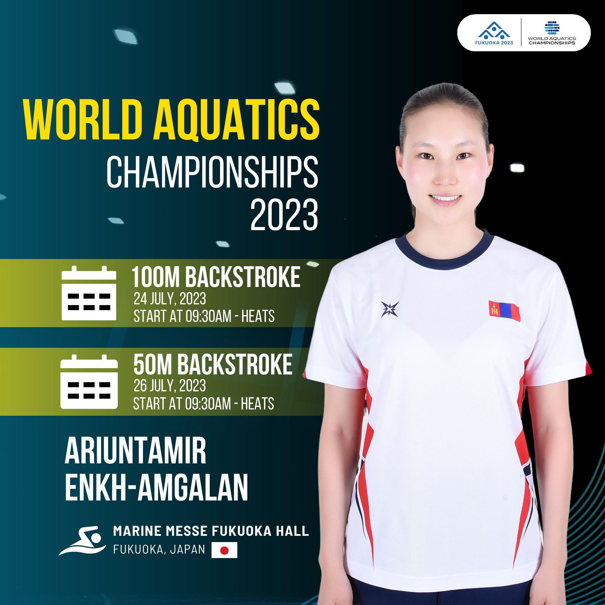 Япон Улсын Фукуока хотод энэ сарын 23-30-ны өдрүүдэд усанд сэлэлтийн дэлхийн аварга шалгаруулах тэмцээн болно. Энэ удаагийн ДАШТ-д ОУХМ Б.Энххүслэн (We Aquatics Club), ОУХМ Б.Энхтамир (We Aquatics Club), ОУХМ Э.Ариунтамир (Selem Zagas Club), ОУХМ Э.Эрхэс (Selem Zagas Club) нар оролцоно. Тэдний дасгалжуулагчаар Х.Батболд, О.Баттулга нар ажилана.