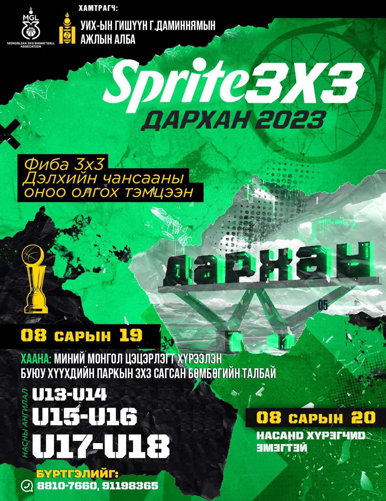 Сагсан бөмбөгийн FIBA 3х3 дэлхийн чансааны оноо олгох “SPRITE 3x3 DARKHAN 2023” сагсан бөмбөгийн тэмцээн энэ сарын 19-20-ны өдрүүдэд болох гэж байна. Энэ удаагийн тэмцээнийг Монголын 3x3 сагсан бөмбөгийн холбоо зохион байгуулж, УИХ-ын гишүүн Г.Дамдиннямын ажлын алба дэмжин ажиллах юм. тус тэмцээн “U13-14”, “U15-16”, “U17-18” насны ангиллаар явагдана. Тэмцээн “Миний Монгол” цэцэрлэгт хүрээлэнгийн 3х3 сагсны талбайд болно.