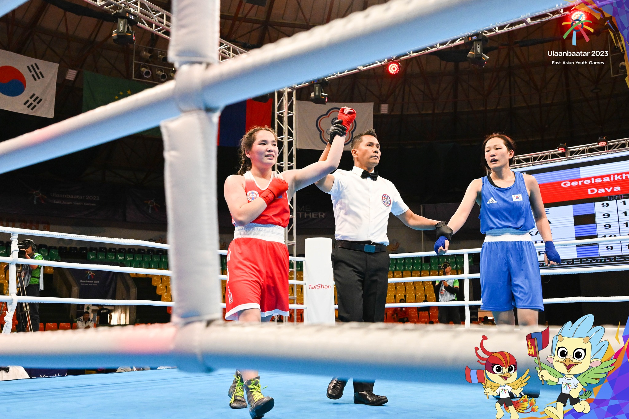 Зүүн Азийн залуучуудын наадмын эмэгтэйчүүдийн боксын 60 кг-д өрсөлдөж буй Д.Гэрэлсайхан Өмнөд Солонгосын Пак Хю Жинийг 4:1 харьцаагаар яллаа. Ингэснээр манай тамирчин маргааш БНХАУ-ын Ли Цян Вентэй алтан медалийн төлөө тулалдана. Өчигдөр өрсөлдсөн манай боксчин Э.Номундарь хагас шигшээд Японы Мику Оикавад ялагдсанаар хүрэл медаль хүртэж байна.