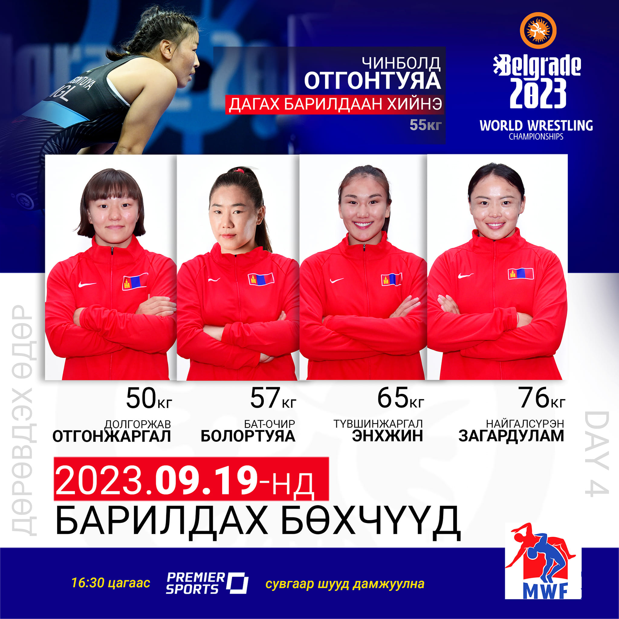 “Белград-2023” ДАШТ-ий дөрөв дэх өдөр өнөөдөр энэ сарын 19-ний өдрийн барилдаан “Штарк арена”-д үргэлжилнэ. Өнөөдөр эмэгтэйчүүдийн 50 кг-д 28 бөх зодоглоно. ДАШТ-ий мөнгө, хүрэл медальт, Монгол Улсын гавьяат тамирчин Долгоржавын Отгонжаргал эхний даваанд гоц мөргөж, ялалт авсан байгаа. Хоёрдугаар тэрбээр тойрогт Франц,Туркийн бөхчүүдийн хэн ялсантай өрсөлдөнө.