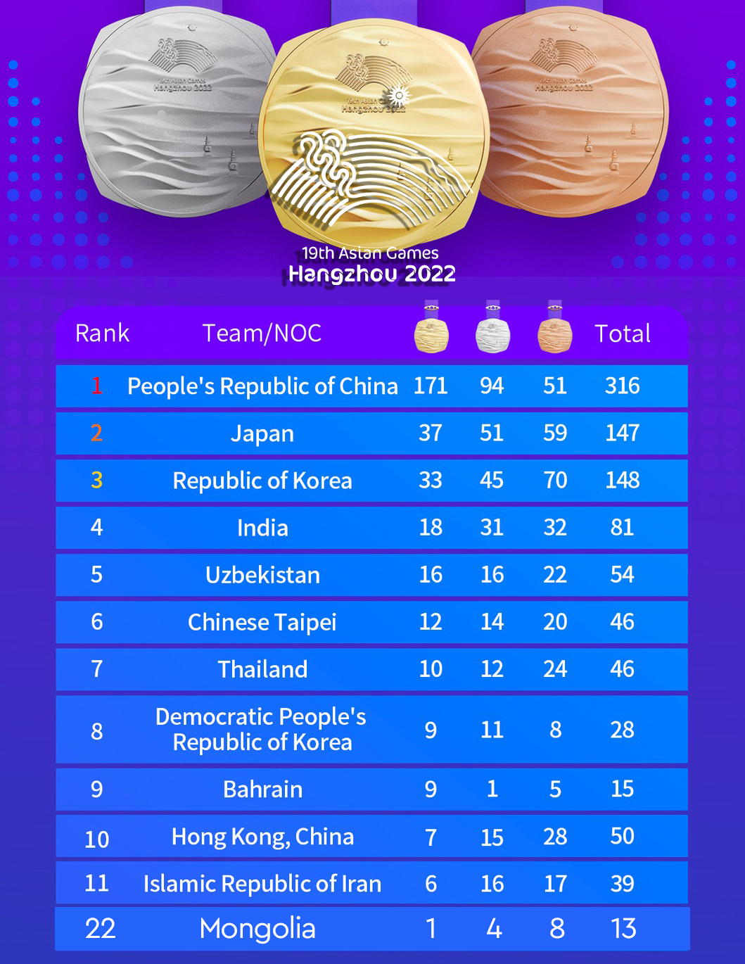 Медалийн тоо болон чансаагаар Хятадын баг тамирчид илт давуу тэргүүлж яваа. Эзэн орны тамирчид одоогоор 316 медаль түүсний 171 нь алтан медаль аж. Японы баг 147, Өмнөд Солонгосын баг 148 медаль хүртсэнээр удаалж байна.