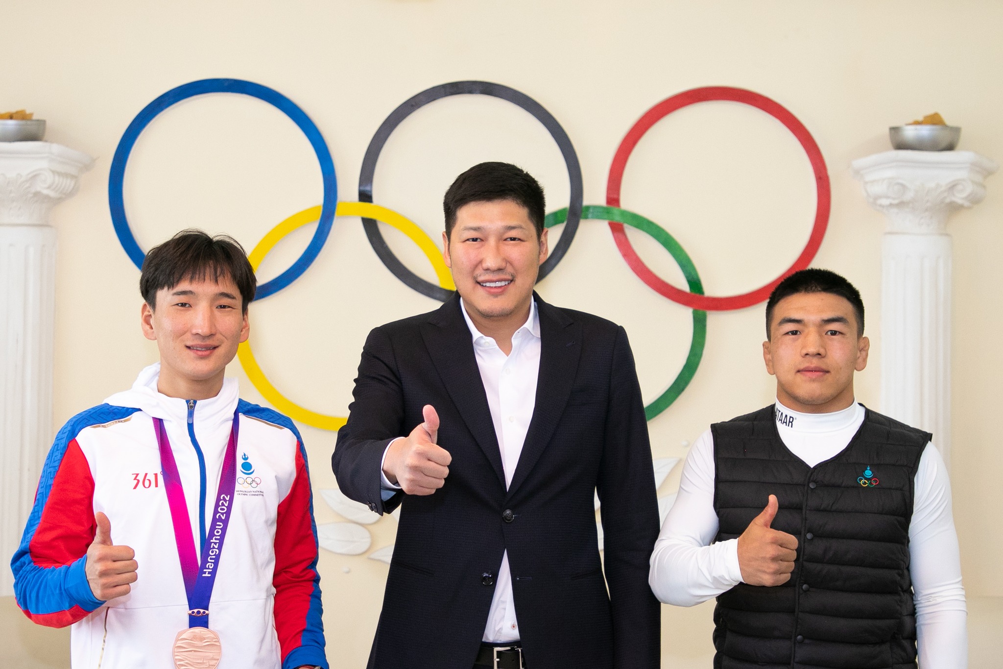 МҮОХ-ны ерөнхийлөгч, ОУОХ-ны Гишүүн Б.Баттүшиг “Ханжоу 2022” Азийн наадмын чөлөөт бөхийн 57кг жингийн аварга, ОУХМ Т.Тулга болон дугуйн засмал замын бөөн гараатай уралдаанаас хүрэл медалийг эх орондоо авчирсан ОУХМ С.Жамбалжамц нарыг “Олимпик хаус”-т хүлээн авч, хүндэтгэл үзүүллээ.