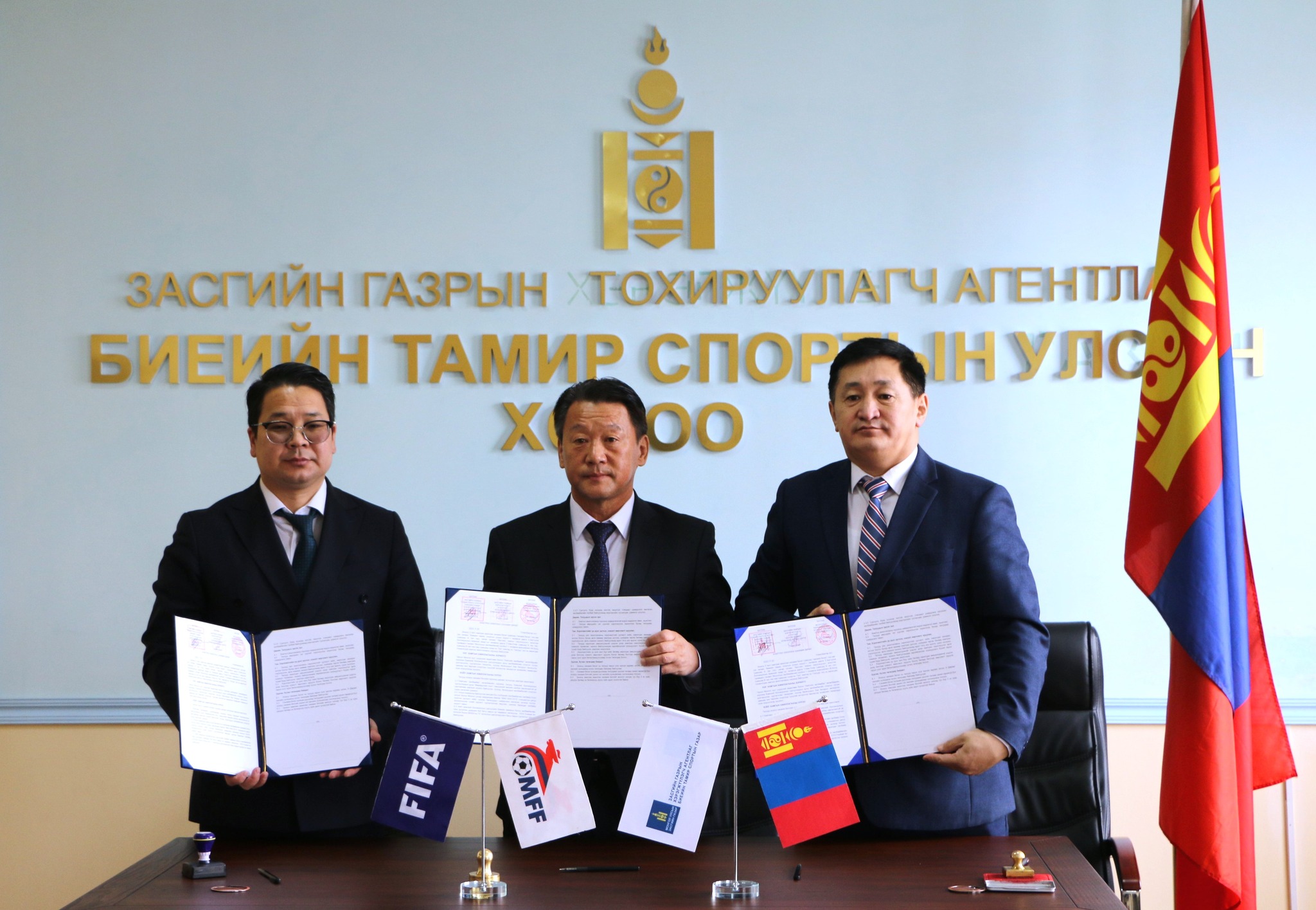 Монгол Улсын Ерөнхийлөгчийн ивээл дор “Эрүүл Монгол хүн” үндэсний хөтөлбөрийн хүрээнд Монголын хөл бөмбөгийн холбооноос санаачилсан “Нийтийн хөл бөмбөг” хөтөлбөрийн хүрээнд Биеийн тамир, спортын улсын хорооны дарга О.Баттулга, МХБХ-ны ерөнхийлөгч М.Болд, Боловсролын ерөнхий газрын дарга Т.Ням-Очир нар хамтын ажиллагааны санамж бичигт гарын үсэг зурлаа.