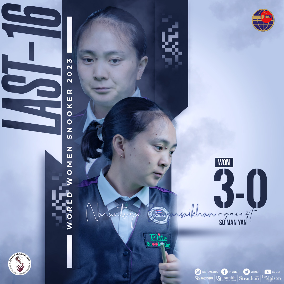 Катар Улсын нийслэл Доха хотод снукер бильярдын дэлхийн аварга шалгаруулах тэмцээн энэ өдрүүдэд ид өрнөж байна. Тэмцээний эмэгтэйчүүдийн төрөлд Монголын тамирчин Б.Нарантуяа хүрэл медалийн болзол хангалаа. Тэрбээр хэсэгтээ Хонконг, Энэтхэг, Польшийн тамирчдыг буулган авсан бөгөөд хагас шигшээд Германы тамирчныг 4:2-оор хожсон байна.