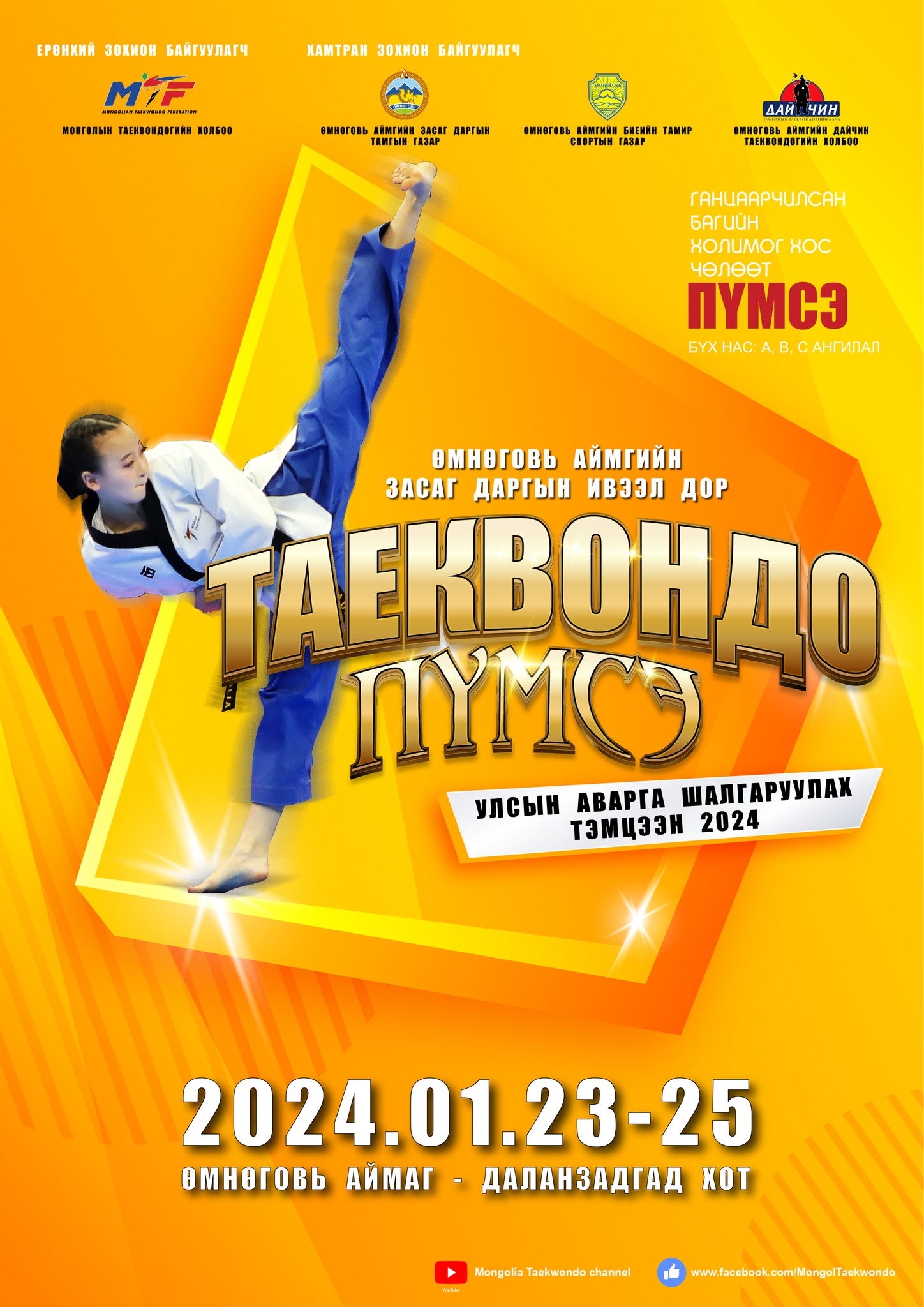 Олимпын таэквондогийн 2024 оны хамгийн эхний тэмцээн "Таэквондо пүмсэ"-ийн Монгол Улсын аварга шалгаруулах тэмцээнээр зохион байгуулагдана. Өмнөговь аймгийн Засаг даргын ивээл дор зохион байгуулагдах "Таэквондо пүмсэ-2024" улсын аварга шалгаруулах тэмцээн 2024 оны нэгдүгээр сарын 23-25-ны өдрүүдэд Өмнөговь аймгийн Даланзадгад хотноо зохион байгуулагдах юм.
