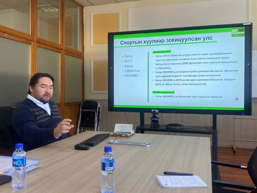 Ажлын хэсгийн гишүүн Ц.Бахытжан гадаад улс орнуудын допингийн эсрэг үйл ажиллагааны эрх зүйн зохицуулалтын онцлог, манай улсад нэвтрүүлж болох боломжуудын талаар хийсэн судалгаагаа танилцуулжээ.Хуулийн төслийг боловсруулах үүрэг бүхий Олимп, нийтийн биеийн тамир, спортын Үндэсний хорооны Ажлын албаны мэргэжилтнүүдийн хүчин чармайлтыг тус ажлын хэсгийн гишүүд өндрөөр үнэлж Монгол Улсын Засгийн газрын хуралдаанаар хэлэлцэн УИХ-д өргөн барихад идэвхтэй оролцохоо тэд илэрхийлжээ.
