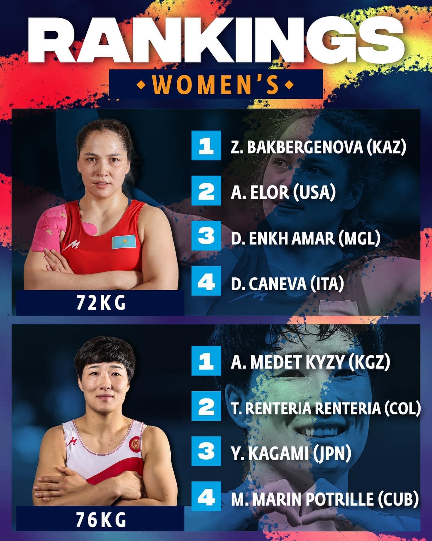 Дэлхийн бөхийн холбооноос эмэгтэйчүүдийн жин тус бүрийн чансаагаар тэргүүлэгч бөхчүүдийг нэрлэсэн байна. Манай тамирчдаас 72 кг-ын жинд ДАШТ- ий мөнгөн медальт, “Алдар” спорт хорооны тамирчин, ОУХМ Э. Даваанасан дэлхийн чансааны гуравдугаар байрт бичигдэж эхэллээ. Чансаа нь манай тамирчдын хувьд 2023 оны ДАШТ болон Азийн наадмын голлосон үзүүлэлт болсон байна. ОУХМ Э.Даваанасан Азийн наадамд барилдаагүй. Хэрэв барилдсан бол түүний чансаа улам ахихаар байжээ.