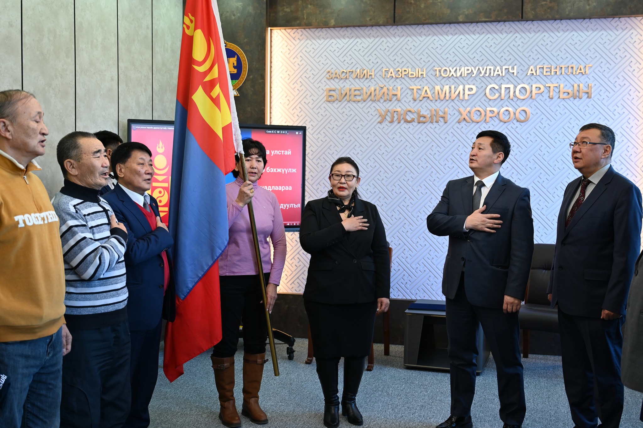 | Мастеруудын өвлийн наадамд оролцох баг, тамирчдад төрийн далбаа гардуулав |
