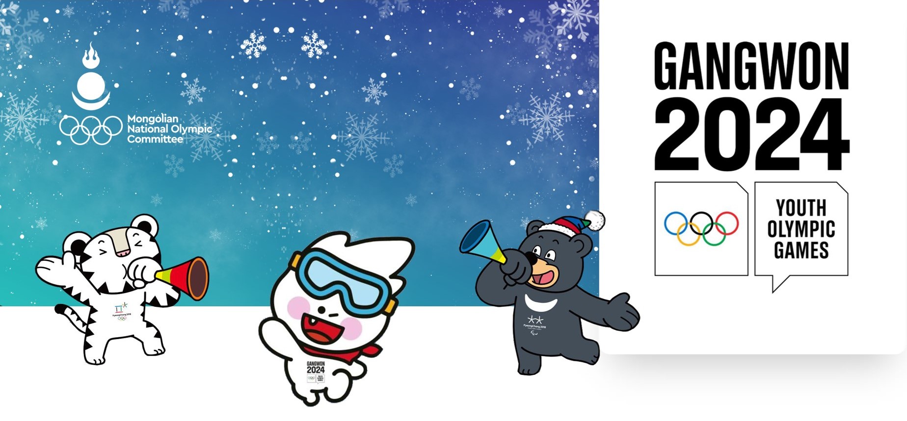 Залуучуудын өвлийн Олимпын бэлгэдэл сахиус өхөөрдөм цасан бөмбөг Мүнчу халуун дулаан сэтгэлээр инээмсэглэн, анд найзуудын хамт гараа даллан "Канвон-2024" наадмын цас мөсөн талбараас мэндчилгээ дэвшүүлж байна.