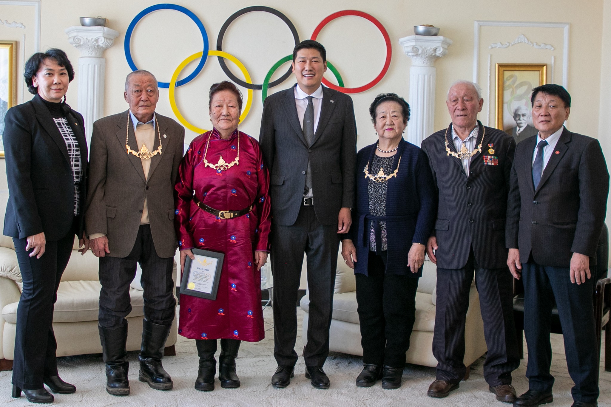 Тэдэнд МҮОХ-ны тэргүүн дээд шагнал “Алтан од” одонг гардууллаа. Ёслолын үеэр ОУОХ-ны гишүүн, МҮОХ-ны ерөнхийлөгч Б.Баттүшиг олимпын хөдөлгөөн дэх ахмад тамирчид, зүтгэлтнүүдийн хувь нэмэр чухал үнэтэйг онцолж, эрүүл энхийг хүсэн ерөөлөө.