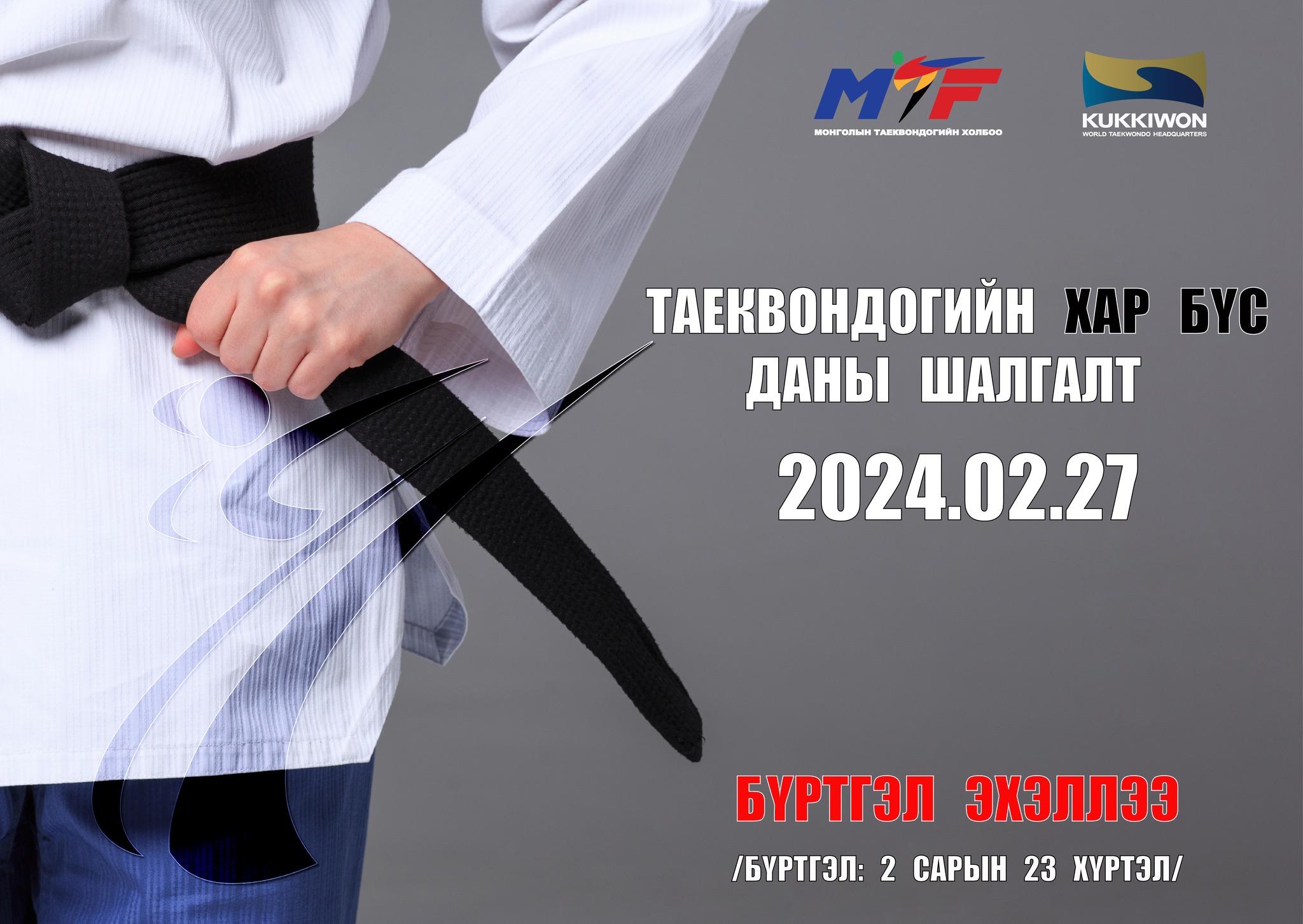 Монголын таэквондогийн холбоо, Дэлхийн таэквондогийн төв Куккивон байгууллагаас 2024 оны хамгийн эхний нэгдүгээр улирлын хар бүс, даны шалгалтыг хоёрдугаар сарын 27-ны өдөр зохион байгуулна.