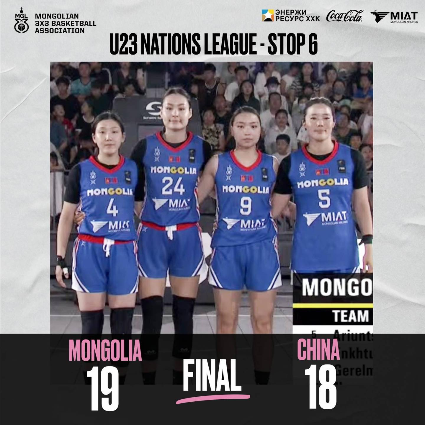 Монгол Улсын “U23” насны эмэгтэй шигшээ баг БНХАУ-д зохион байгуулагдаж буй “FIBA 3x3 Nations League” тэмцээний сүүлийн stop-ийн аварга багаар тодорлоо. Финалд манай охидын баг Хятадын шигшээ багийг эцсийн мөчид 19:18-аар хожлоо.