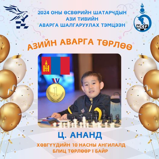 Казакстан Улсын Алматы хотод болсон өсвөрийн шатарчдын Азийн аварга тэмцээнээс Ц.Ананд алтан медаль хүртлээ. Тус тэмцээнд манай улсаас 27 тамирчин оролцсон байна. Манай тамирчид нийт гурван ганцаарчилсан төрөлд өрсөлдөж нэг алт, хоёр мөнгө, нэг хүрэл медалийн амжилттайгаар тэмцээнээ өндөрлөж байна.