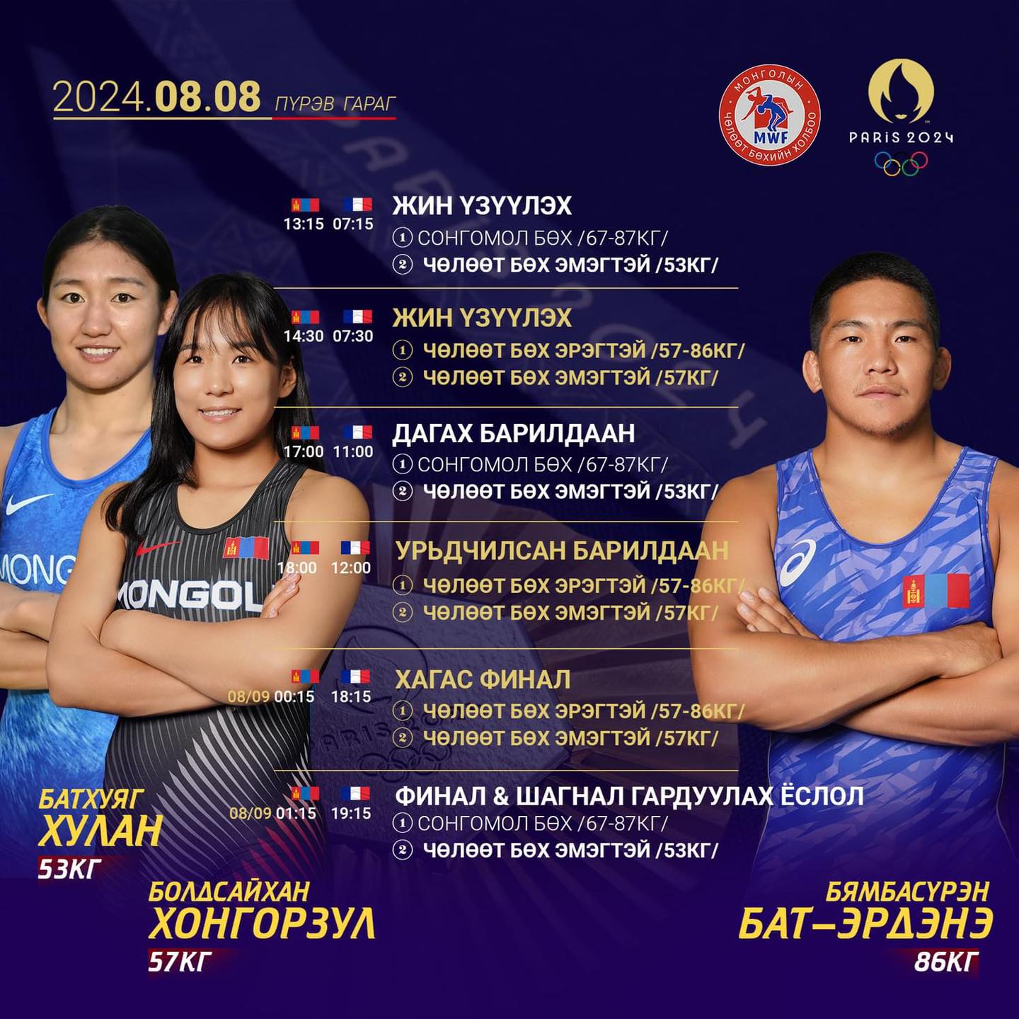 “Парис 2024” зуны олимпын ХХХIII наадмын чөлөөт бөхийн эмэгтэйчүүдийн 57 кг-ын жинд Ази тивийн аварга шалгаруулах тэмцээний хүрэл медальт, “U23” насны Ази тивийн аварга, “Токио-2020” зуны олимпын наадмын шагналт тавдугаар байр, Үндэсний шигшээ багийн тамирчин, ОУХМ Болдсайханы Хонгорзул өрсөлдөнө. Манай тамирчин олимпын наадмын эхний барилдаанд “Ханжоу-2022” Азийн наадмын хүрэл медальт БНХАУ-ын Хун Кө Шиньтэй учраа таарлаа. Хэрэв түүнийг ялах юм бол Нигер, Алжирын бөхчүүдийн ялсантай барилдана.
