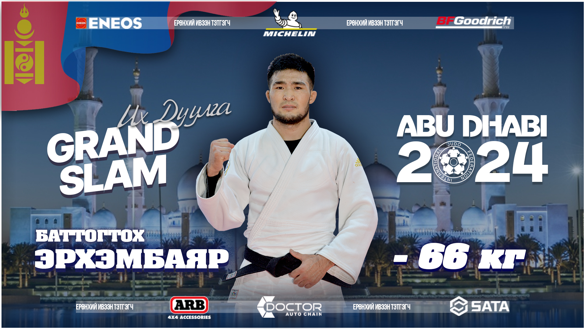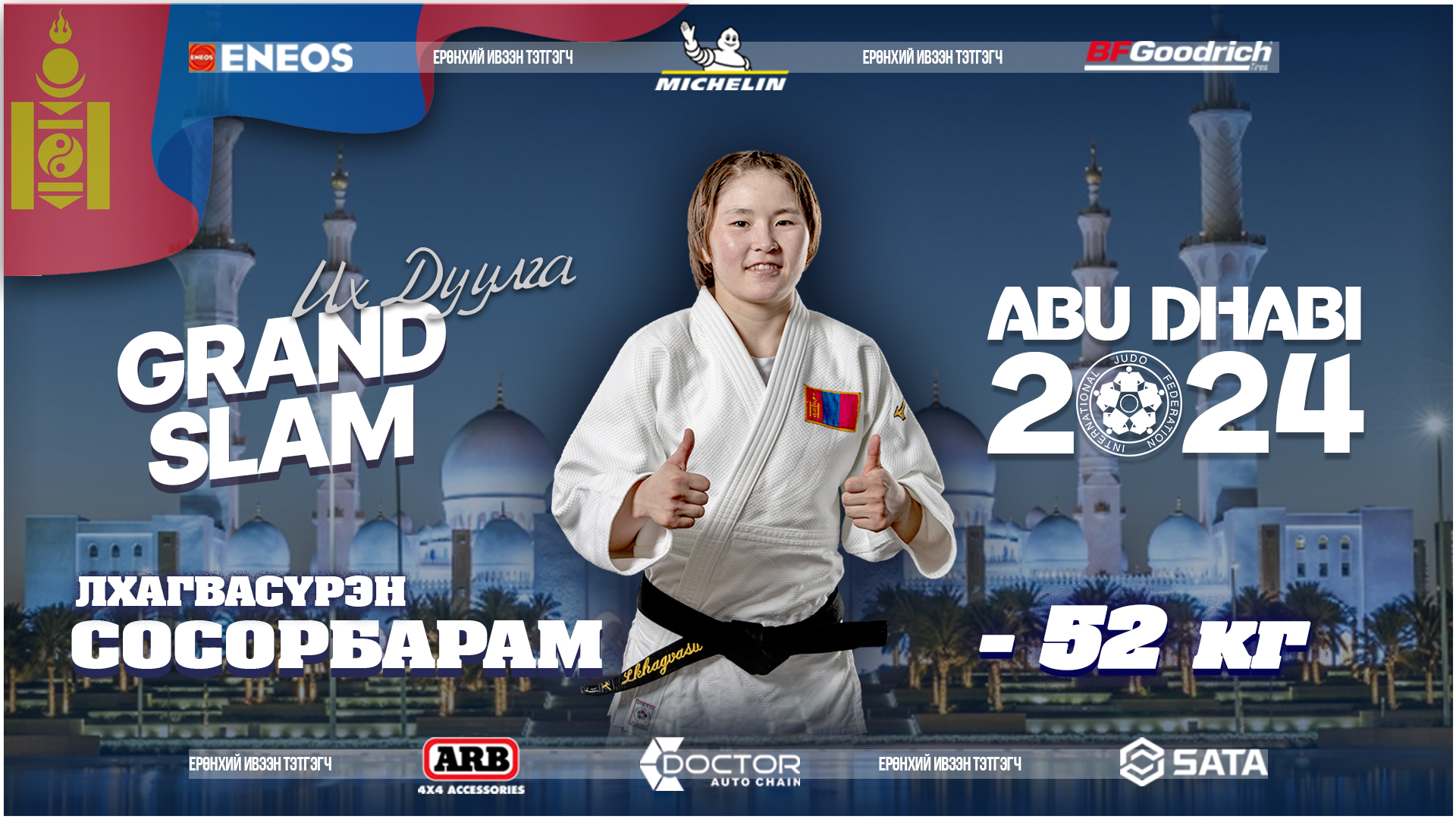 Олон улсын жүдо бөхийн холбоо, “IJF”-ийн календарчилсан төлөвлөгөөнд багтсан жүдо бөхийн “Абу Даби-2024” их дуулга тэмцээн энэ сарын 11-13-ны өдрүүдэд Арабын Нэгдсэн Эмират Улсын Абу Даби хот болж өндөрлөв. Энэ удаагийн их дуулга тэмцээнд 32 орны эрэгтэй 162, эмэгтэй 72, нийт 234 тамирчин барилдсан. Эхний өдрийн эрэгтэйчүүдийн 60 кг-ын жинд 25 тамирчин барилдаж IJF-ийн нэр дээр барилдсан ОХУ-ын Iznaur SAAEV түрүүлэв. 73 кг-д АНЭУ-ын нэр дээр барилдаж эхэлсэн ОХУ-ын бөх Makhmadbek MAKHMADBEKOV, 81 кг-д Азербайжаны Zelim TCKAEV алтан медаль хүртсэн. Харин эмэгтэйчүүдийн 48 кг-ын жинд “IJF”-ийн нэр дээр барилдсан ОХУ-ын Marina VOROBEVA , 57 кг-д Германы Seija BALLHAUS нар алтан медаль тус тус хүртэв.