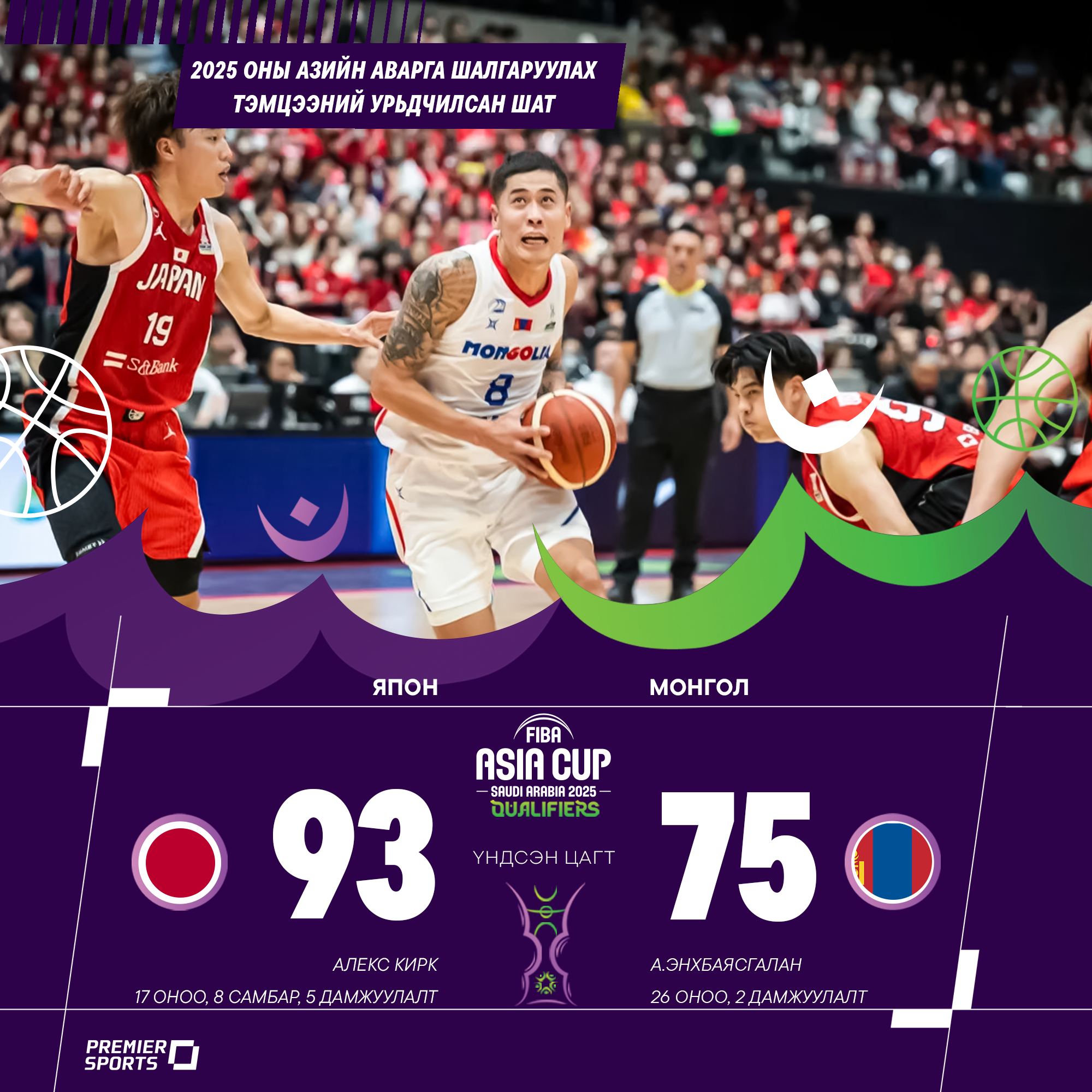 Сагсан бөмбөгийн “FIBA Asia Cup 2025 Qualifiers” -ийн урьдчилсан шатны эхний тоглолт боллоо. Тус тоглолт Япон Улсын Токио хотод өчигдөр орой явагдаж өндөрлөв. Тус тоглолтод талбайн эзэн Японы багийн эсрэг Монголын залуучууд амжилттай өрсөлдөж 93:75-аар хожигдол хүлээв.