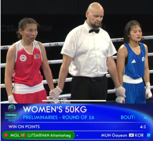 Английн Шейфилд хотод болж буй боксын дэлхийн цомын тэмцээн энэ сарын 25-аас, ирэх сарын 2-ны өдрүүдэд үргэлжилнэ. Тэмцээний эхний өдөр эмэгтэйчүүдийн 50 кг-ын жинд Л.Алтанцэцэг, Өмнөд Солонгосын Мун Гаёныг 4:1-ийн харьцаагаар, эрэгтэйчүүдийн 71 кг-д Б.Мишээлт, Тайландын Чансом Виттайяг 4:1-ийн харьцаагаар ялжээ..