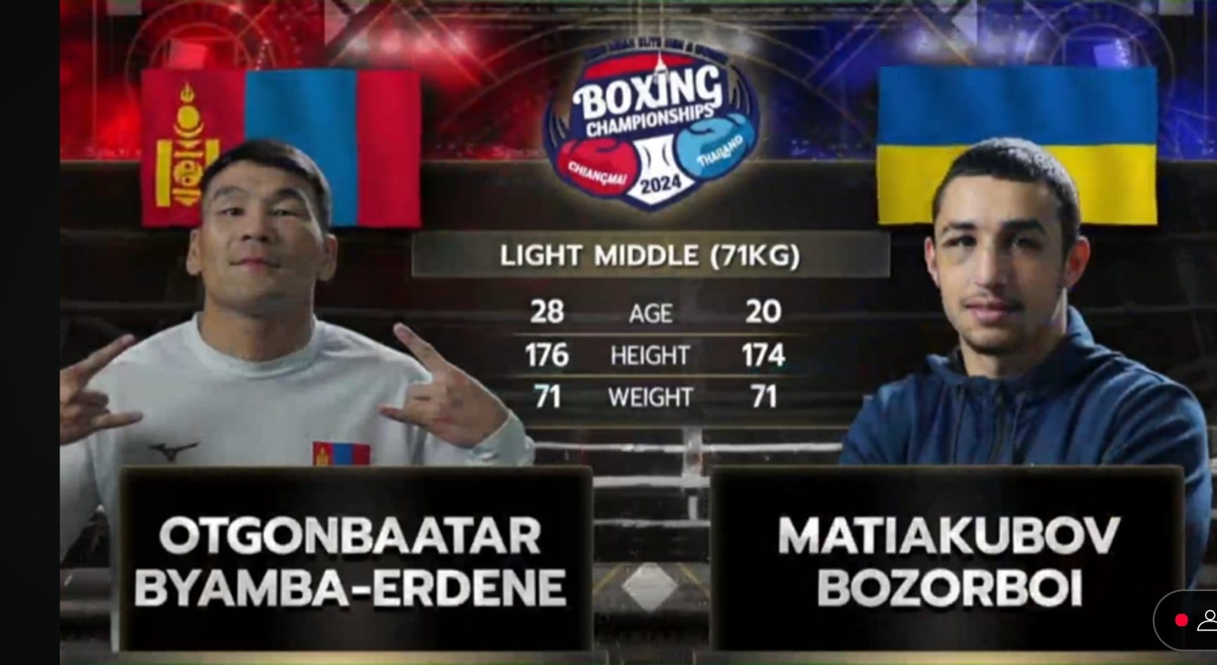 Сонирхогчдын боксын насанд хүрэгчдийн Ази тивийн аварга шалгаруулах тэмцээн Тайланд Улсын Чянг Май хотод арваннэгдүгээр сарын 28-аас арванхоёрдугаар сарын 12-ны өдрүүдэд үргэлжилж өндөрлөх юм. Тус Азийн аварга шалгаруулах тэмцээний тав дахь өдөр эрэгтэйчүүдийн 71 кг-ын жинд О.Бямба-Эрдэнэ хүрэл медалийн төлөөх тулаанд Украины боксчинг хожиж хүрэл медалийн болзол хангасан байна. Тэрбээр энэ сарын 8-ны өдөр мөнгөн медалийн төлөөх тулаанд Узбекистаны боксчинтой тулалдана.