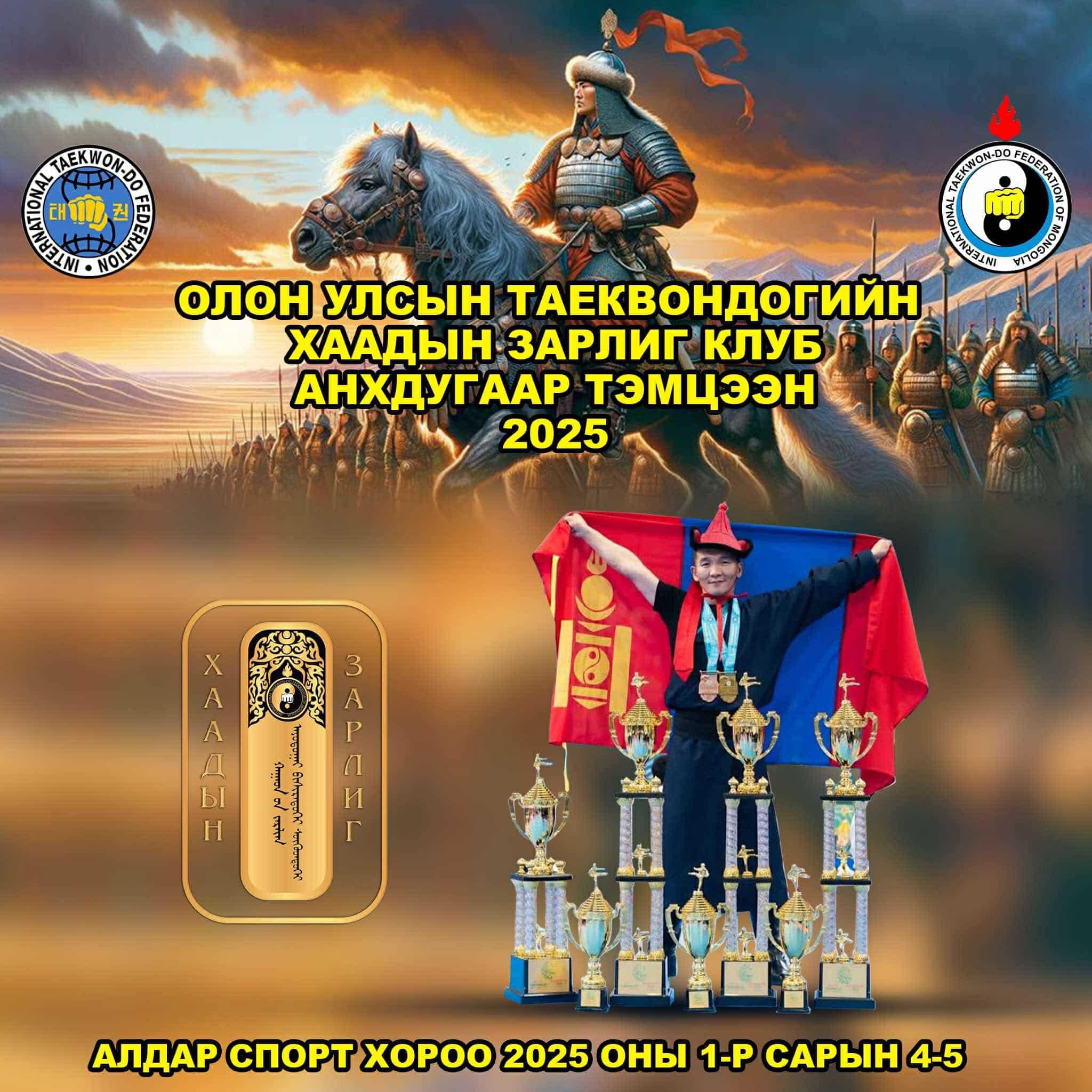 Олон улсын таэквондогийн “ХААДЫН ЗАРЛИГ” клубийн нэрэмжит анхдугаар тэмцээн болно. Тус тэмцээн 2025 оны нэгдүгээр сарын 4-5-ны өдрүүдэд зэвсэгт хүчний “Алдар” спорт хорооны зааланд зохион байгуулагдах гэж байна.