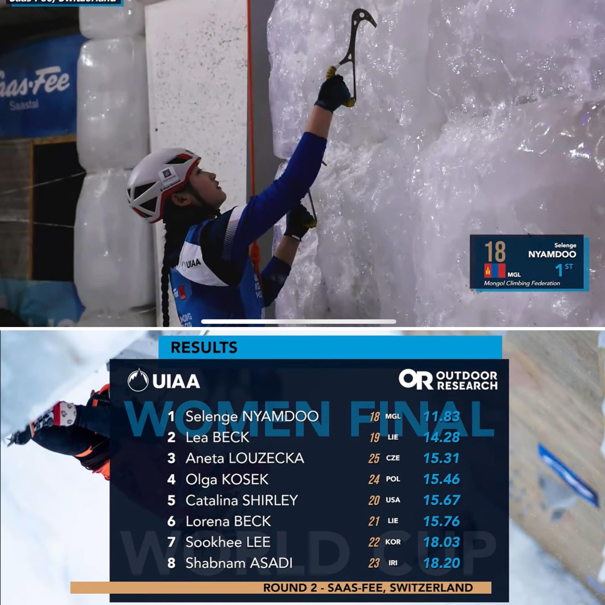 Швейцарын Саас Фээд зохиогдож байгаа ОУУХ(UIAA)-ны мөсөнд авиралтын дэлхийн цомын аварга шалгаруулах тэмцээн болж байна. Тус дэлхийн цомын эмэгтэй хурдны төрөлд "Сутайн бор"клубийн тамирчин, МУБИС-ийн Биеийн Тамирын сургуулийн Спорт аялал жуулчлалын ангийн оюутан ОУХМ Н.Сэлэнгэ алтан медаль хүртэж дэлхийн цомын аварга боллоо.