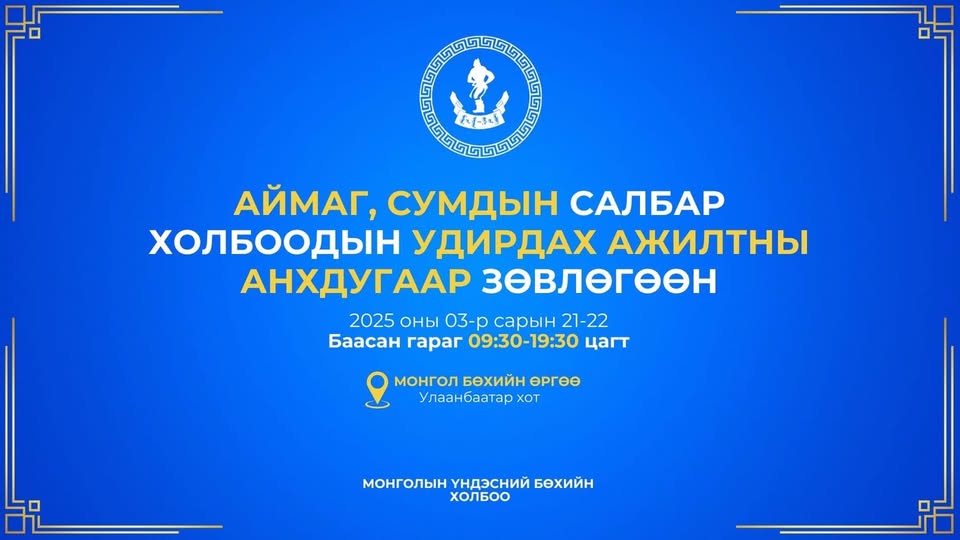 Монголын үндэсний бөхийн холбооноос орон нутгийн бөхийн холбоодын удирдах ажилтнуудын анхдугаар зөвлөгөөнийг 2025 оны гуравдугаар сарын 21-ний өдөр “Монгол бөхийн өргөө”-нд зохион байгуулна. Энэхүү зөвлөгөөн нь дараах сэдвийн хүрээнд зохион байгуулагдана.