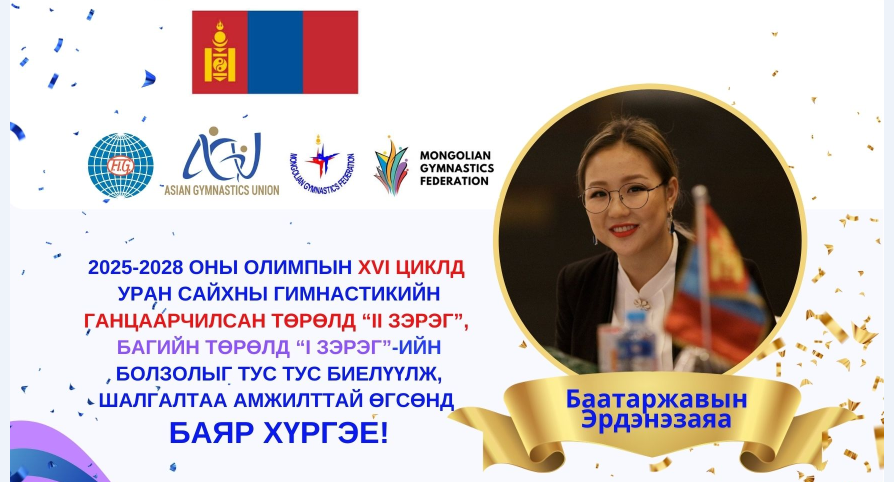 2025-2028 оны олимпын циклд уран сайхны гимнастикийн төрөлд Монголын гимнастикийн холбооноос Олон улсын шүүгчийн эрхийг шалгалтад Б.Эрдэнэзаяа, Б.Болормаа, Б.Халиун, Ц.Зулзаяа, Т.Цэрэндулам, Т.Болор, Г.Золзаяа, Б.Ууганбаяр, Х.Ундрам, Б.Батбагана нар амжилттай оролцов. Олон улсын шүүгчийн ганцаарчилсан төрөлд арван шүүгч (2-р зэргийг нэг шүүгч, 3-р зэргийг долоон шүүгч, 4-р зэргийг хоёр шүүгч) хангав. Багийн төрөлд арван шүүгч (1-р зэргийг нэг шүүгч, 2-р зэргийг хоёр шүүгч, 3-р зэргийг наймн шүүгч) тус тус амжилттай эрхийг сунгаж, зэргээ ахиуллаа.