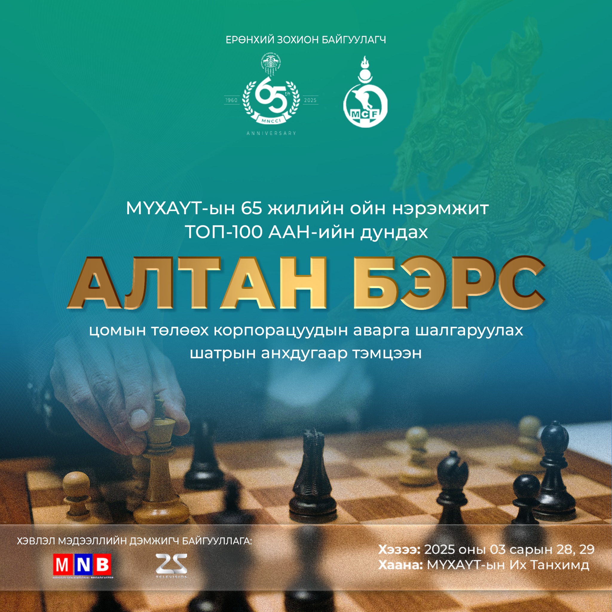 Монголын үндэсний худалдаа аж үйлдвэрийн танхимын 65 жилийн ойг тохиолдуулан оюуны спортыг түгээн дэлгэрүүлэх, Монгол Улсын “ТОП-100” ААН-ийн дундах “Алтан бэрс” цомын төлөөх корпорацуудын шатрын аварга багийг шалгаруулах тэмцээн болно.