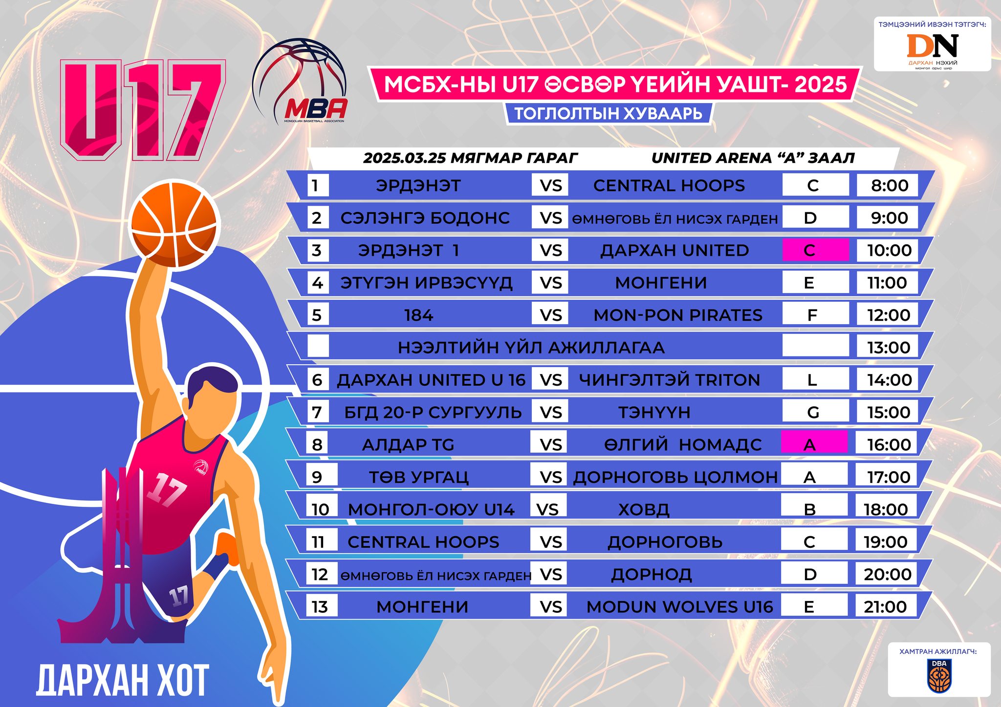 Дархан-Уул аймгийн Дархан хотод “U-17” ангиллын сагсан бөмбөгийн өсвөр үеийн УАШТ-2025 тэмцээн эхэллээ. Тус УАШТ Дархан хотын “United Arena”-д болж байна. Энэ удаагийн “U-17” ангиллын УАШТ-д эрэгтэй 40, эмэгтэй 13 баг нийт 720 гаруй тамирчин өрсөлдөж эхэллээ.