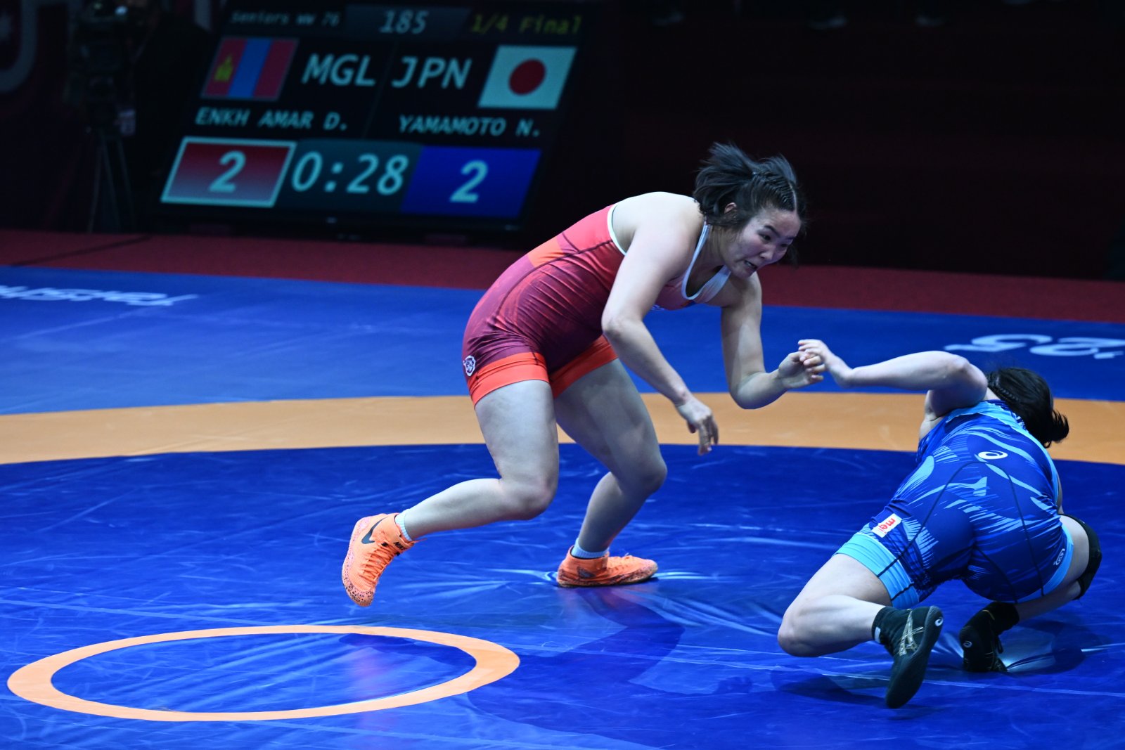 Азийн аваргын эмэгтэйчүүдийн 76 кг-ын жинд зодоглож буй ДАШТ-ий мөнгөн медальт Э.Даваанасан шөвгийн наймд Японы бөх, “U-20” насны Ази тивийн аварга, өсвөрийн ДАШТ-ий хүрэл медальт Нодока Ямамототой хүч сорив.Энэ барилдаанд оноо 2:2 болон тэнцэж, манай бөх сүүлийн оноо авсан үзүүлэлтээр илүүрхэж явсан ч цаг дуусахын өмнөхөн ардаа гарган хоёр оноо алдсанаар 4:2-оор харамсалтай ялагдлаа. Хэрэв Японы бөх хагас шигшээд Энэтхэгийн бөхийг ялан финалд шалгарвал Э.Даваанасан дагаж барилдах болно.