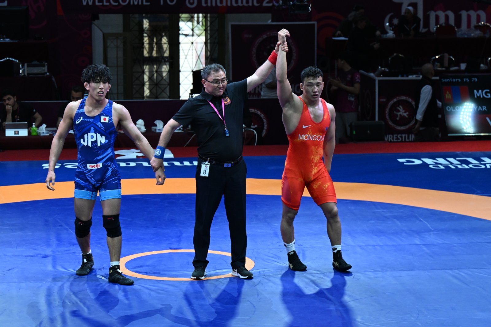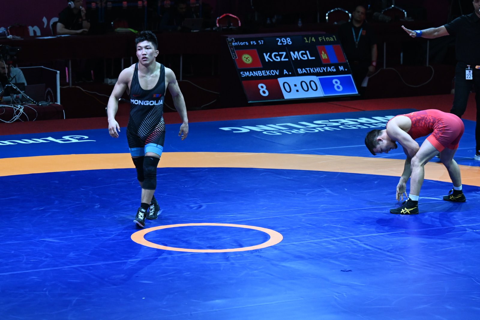 Харин 57 кг-ын жинд хүч сорьж буй ОУХМ Б.Мөнх-Эрдэнэ мөн л эхний хоёр өрсөлдөгчөө хожиж, их шөвөгт үлдээд байна. Тэрбээр шөвгийн наймд Киргизстаны бөх, Азийн аваргын мөнгө, хүрэл медальт Алмаз Сманбековыг буулгаж авсан юм. Барилдаан ширүүн өрсөлдөөнтэй өрнөж, үндсэн цаг 8:8-аар тэнцэж дууссан бөгөөд манай бөх бүхэл онооны чанараар ялалт байгууллаа. Б.Мөнх-Эрдэнэ хагас шигшээд Хойд Солонгос буюу БНАСАУ-ын бөх, Азийн наадмын мөнгөн медальт Хан Чон Сонтой барилдана. Хагас шигшээд шалгарсан дараагийн бөх нь 79 кг-ын жинд ОУХМ О.Сүлдхүү байв. Тэрбээр дунд шөвөгт Японы бөх, U-20 ДАШТ-ий мөнгөн медальт Рюносүкэ Камияг 4:0-ээр хожлоо.
