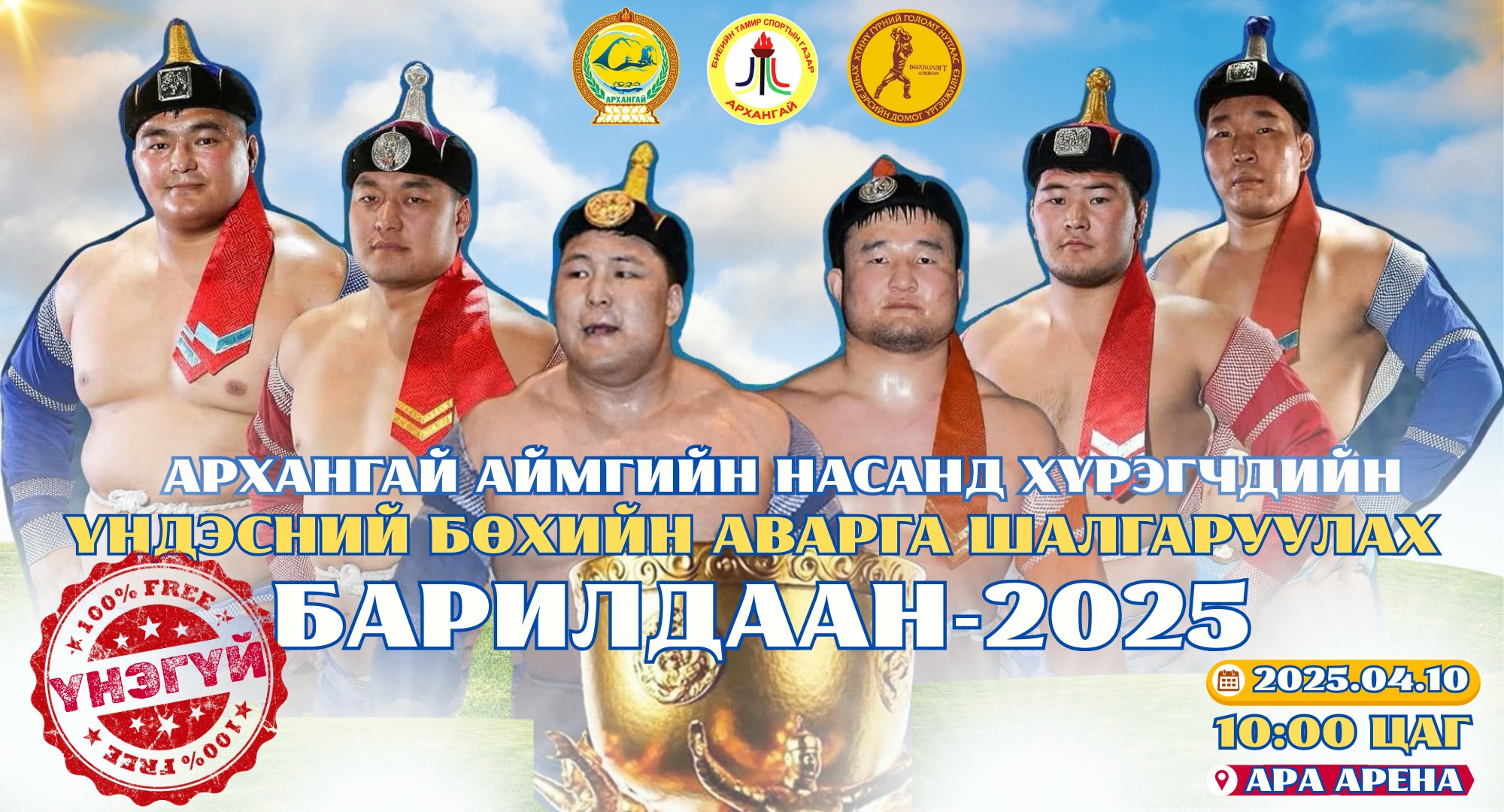Архангай аймгийн насанд хүрэгчдийн 2025 оны үндэсний бөхийн аварга шалгаруулах барилдаан болно. “Бөх Билигт” дэвжээний энэ цагийн идэр хүчтэнүүд цуглаж, Архангай нутгийнхаа аваргыг тодруулах юм. Тус барилдаан 2025 оны дөрөвдүгээр сарын 10-ны өдөр, 10:00 цагаас Архангай аймгийн “АРА АРЕНА”-д болох юм.