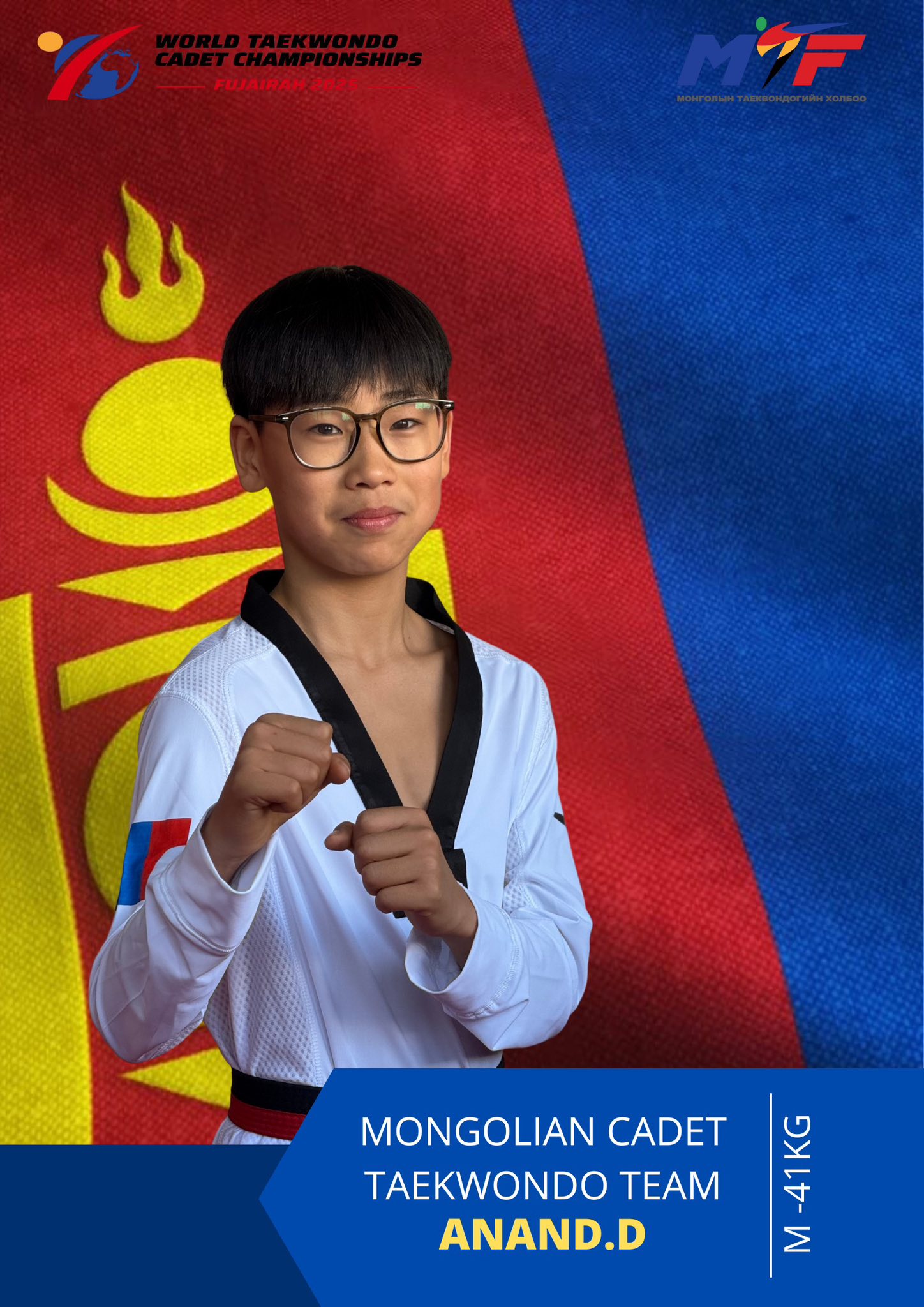 Олимпын таеквондогийн Өсвөр үеийн ДАШТ-ний сүүлийн өдөр эхэллээ. Дэлхийн таэквондогийн холбооны өсвөр үеийн дэлхийн аварга АНЭУ-ын Фужира хотод өнөөдөр хуваарь ёсоор хөвгүүдийн 41 кг, 57 кг, охидын 37 кг, -59 кг-ын жингийн тулаанууд явагдах ба манай улсаас дараах тамирчид өрсөлдөнө.