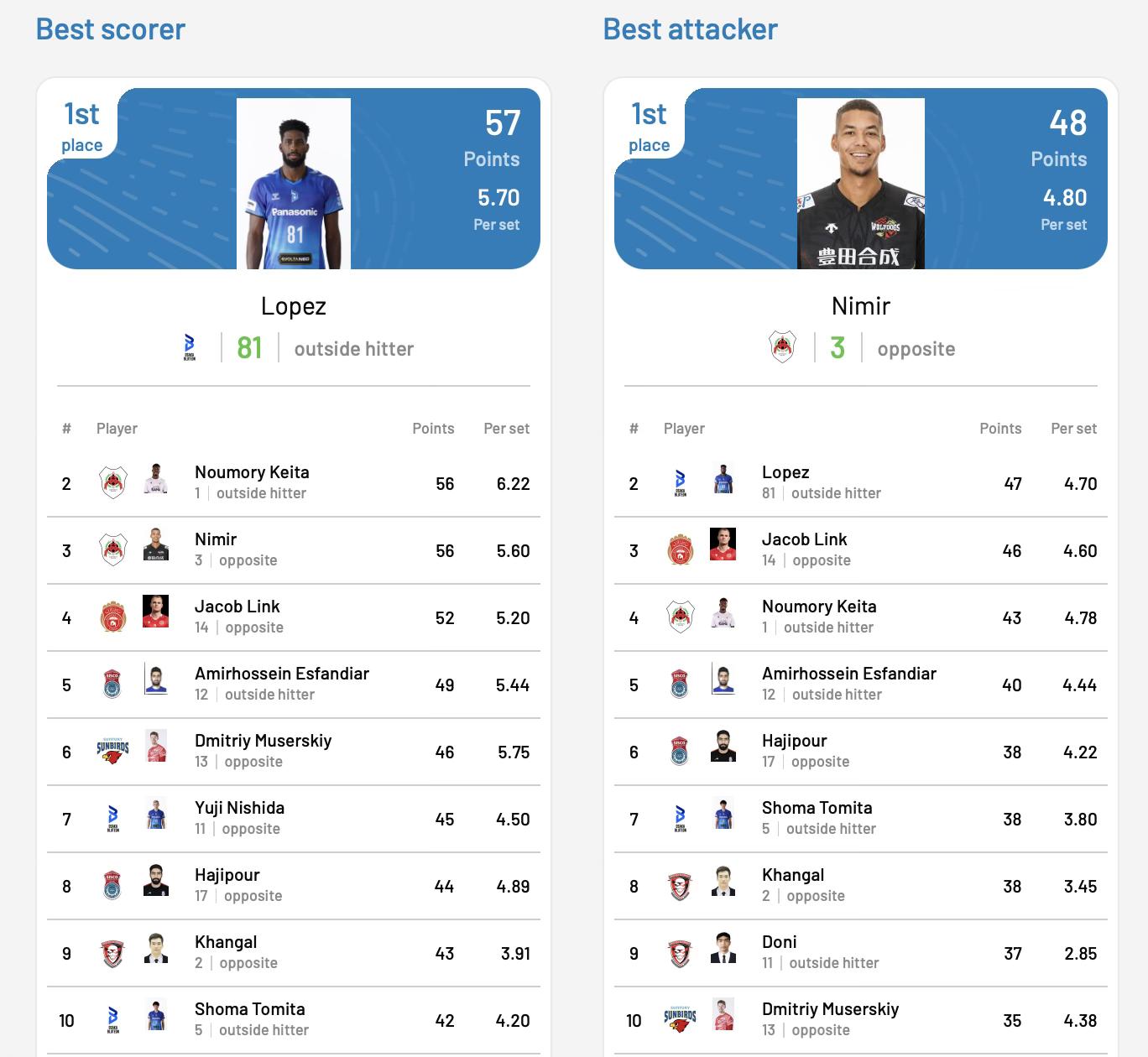 Манай тамирчин Т.Хангалын хувьд эхний гурван ээлжинд тоглож, арван оноо авсан үзүүлэлт гаргалаа. Ингэснээр шөвгийн наймын тоглолтуудын дараах байдлаар нийт авсан оноогоор IX байрт, довтолгооны оноогоор VIII байрт жагсаж, аль аль үзүүлэлтээрээ эхний аравт орсон бахархам амжилт гаргалаа. Довтолгооны үзүүлэлтээр түүний ард Ran Takahashi, Earvin Ngapeth, Tine Urnaut, Dmitriy Muserskiy, Yuji Nishida, Śliwka, Kubiak нарын шилдгүүд бичигдэж байна.