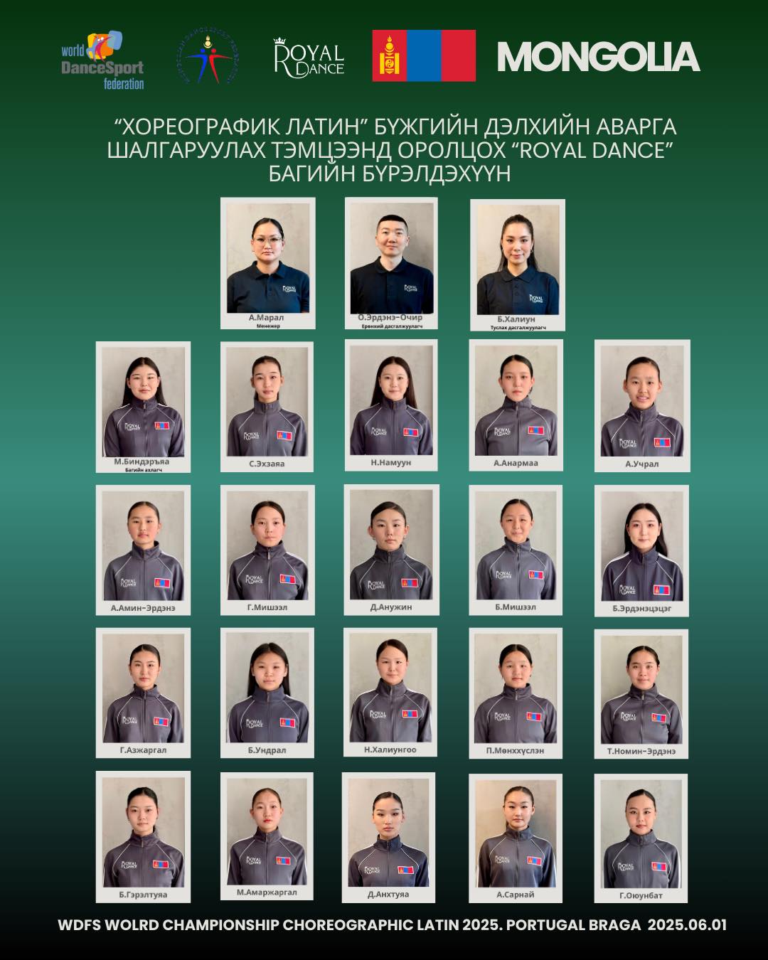 Португаль Улсын Брага хотод бүжгийн спортын дэлхийн аварга шалгаруулах тэмцээн зургадугаар сарын 1-ний өдөр болох гэж байна. Энэ удаагийн “Хореографик Латин” бүжгийн ДАШТ-нд оролцох “WDSF”, “Монголын бүжгийн спортын холбоо” -ны гишүүн “Royal dance” бүжгийн клубийн дэргэдэх “Royal dance” хамтлагийн үндсэн бүрэлдэхүүнийг зарлалаа.
