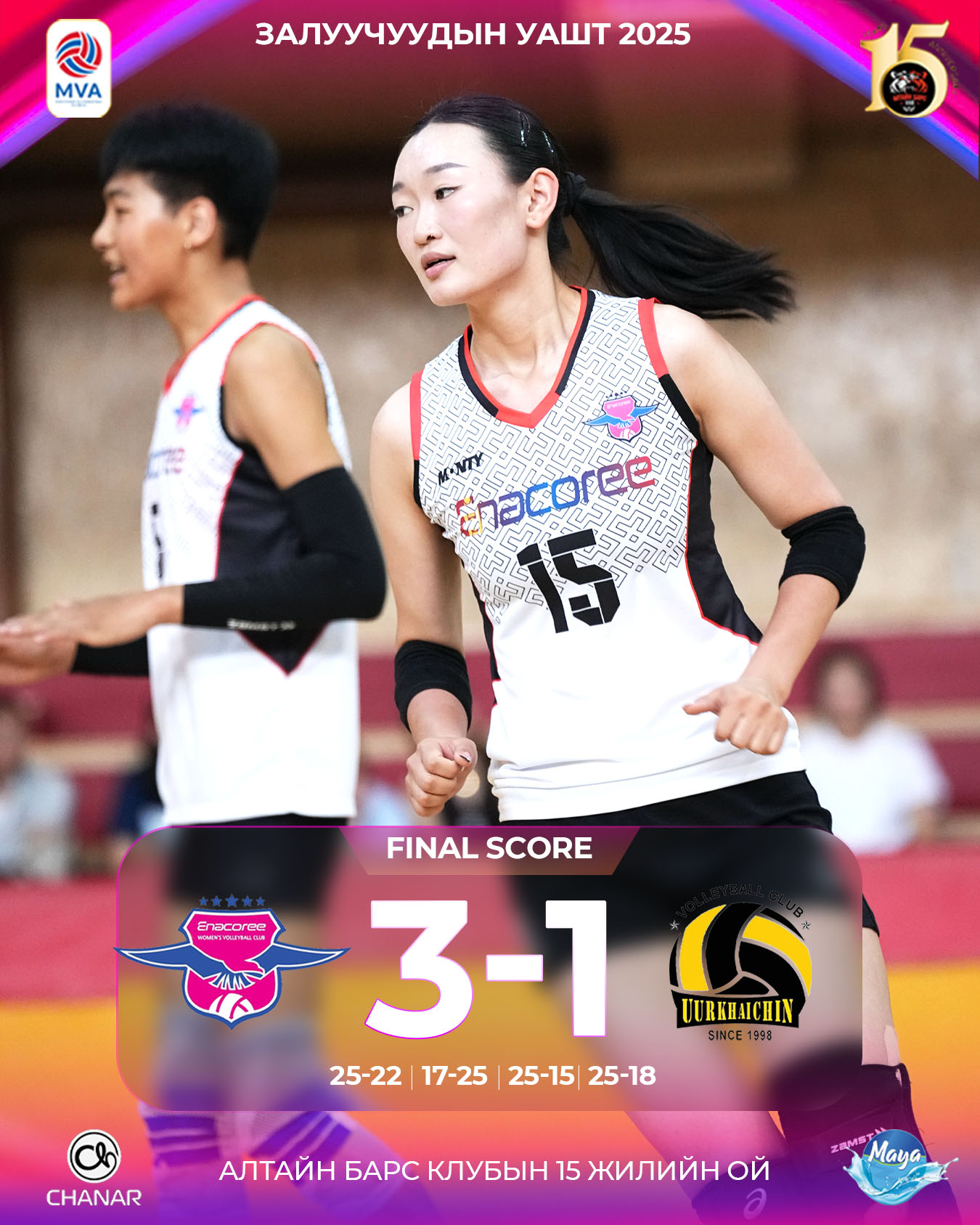 Монголын волейболын холбооны “Алтайн барс” клубийн 15 жилийн ойн нэрэмжит залуучуудын улсын аварга шалгаруулах тэмцээний 2025 оны хагас шигшээ тоглолтууд өнөөдөр болж байна. Эмэгтэй багаас “Энагурэ” баг, Хэнтий аймгийн “Уурхайчин” багийг эхний үед 25:22-оор, хоёрдугаар үед 17:25, гуравдугаар үед 25:15-аар, дөрөвдүгээр үед 25:18-аар, дөрвөн үеийн тоглолтын эцэст 3:1-ээр хожил авч чадлаа.