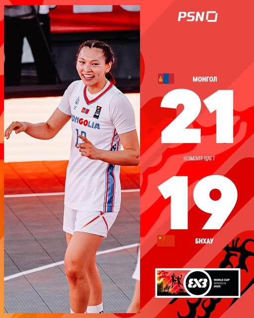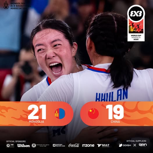 Монгол Улсад болж буй сагсан бөмбөгийн “FIBA 3x3 World Cup 2025” ДАШТ-ий эмэгтэйчүүдийн ангилалд Монгол Улсын шигшээ баг Хятадын багуудын хасагдах шатны тоглолт боллоо. Тус тоглолтын үндсэн цагт хоёр баг 19:19-өөр оноо тэнцэж, нэмэлт цагт 21:19-өөр Монгол Улсын баг хожиж, FIBA 3x3 ДАШТ-ий шөвгийн наймд шалгарлаа. Одоо маргааш зургадугаар сарын 28-ны орой АНУ-ын багтай тоглоно.