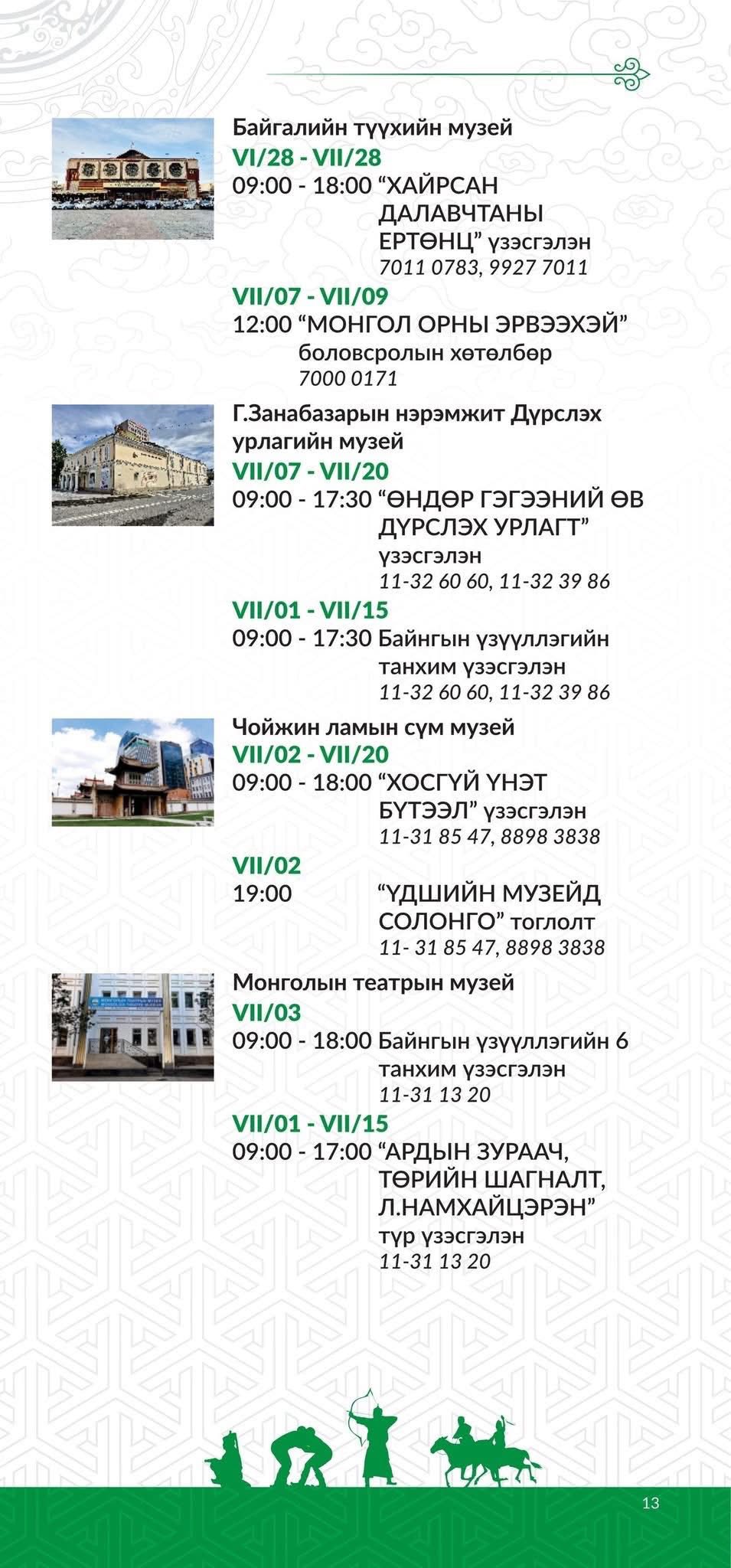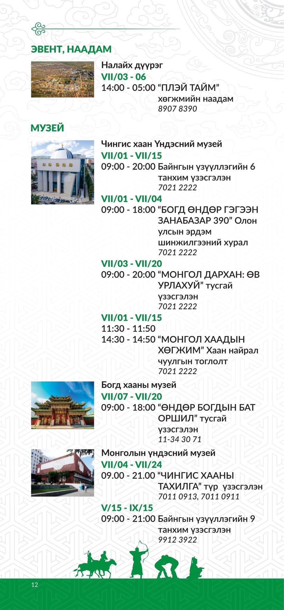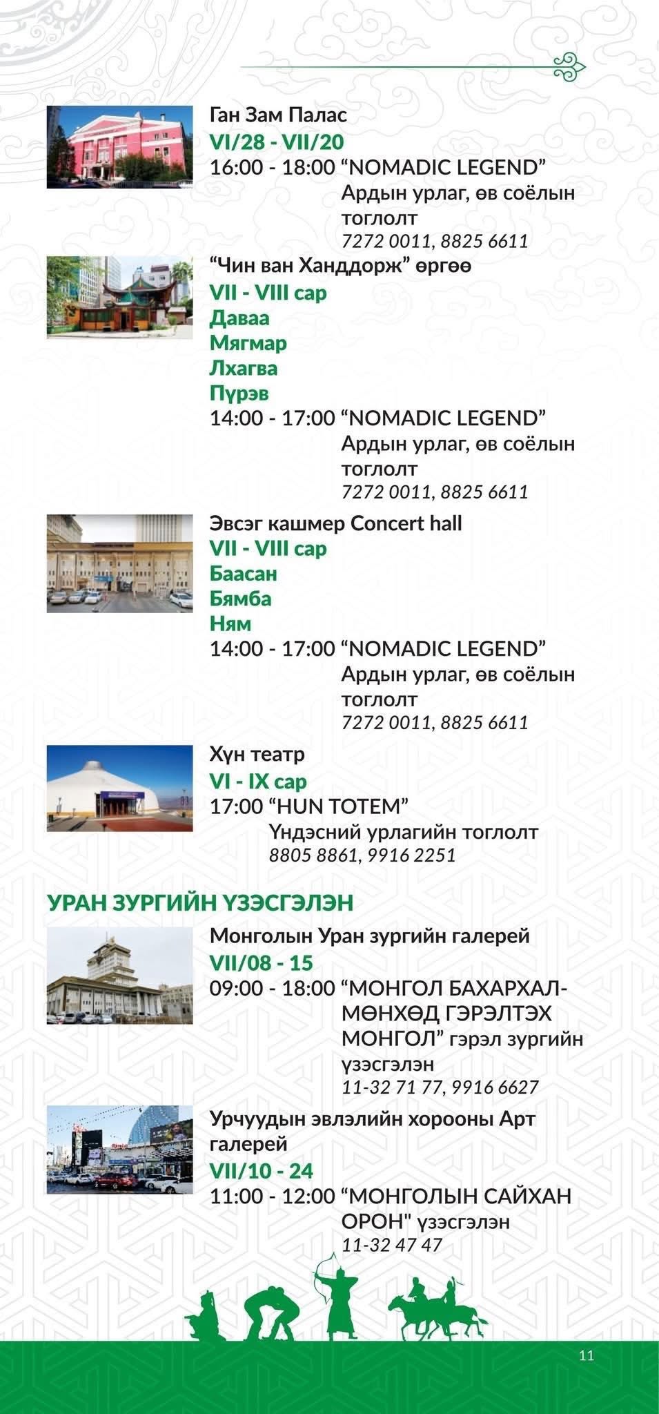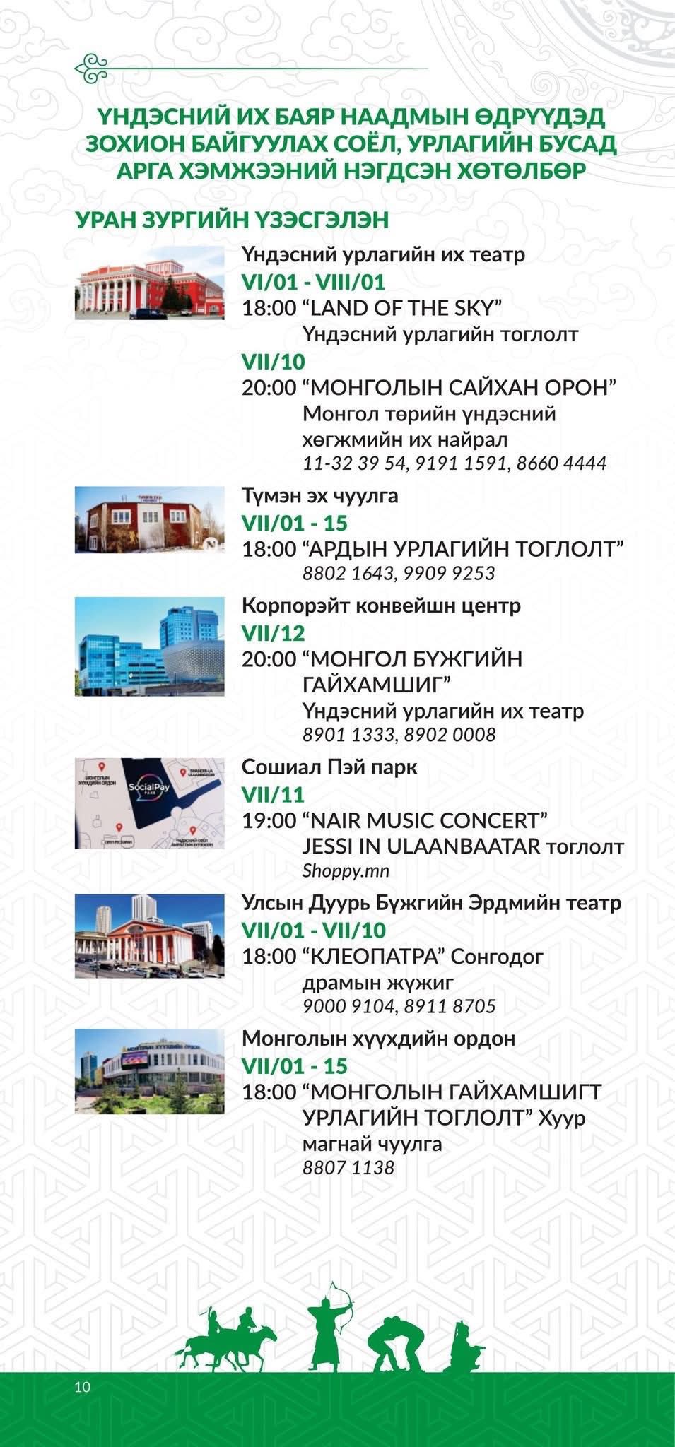 ТУЛГАР ТӨРИЙН 2234 ЖИЛ, ИХ МОНГОЛ УЛСЫН 819 ЖИЛ, ТУСГААР ТОГТНОЛОО СЭРГЭЭН МАНДУУЛСНЫ 114 ЖИЛ, АРДЫН ХУВЬСГАЛЫН 104 ЖИЛИЙН ОЙД ЗОРИУЛСАН ҮНДЭСНИЙ ИХ БАЯР НААДМЫН ӨДРҮҮДЭД ЗОХИОН БАЙГУУЛАГДАХ УРЛАГ, СОЁЛЫН ТОГЛОЛТ, ҮЗВЭР ҮЙЛЧИЛГЭЭНИЙ ХӨТӨЛБӨР ГАРЛАА.