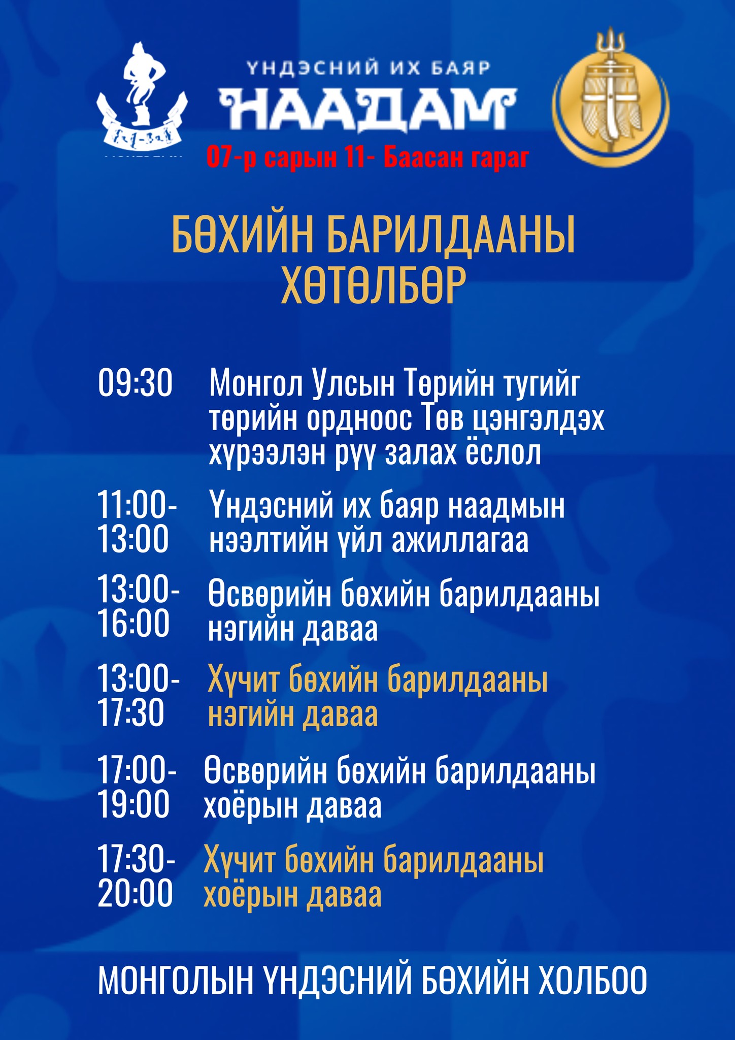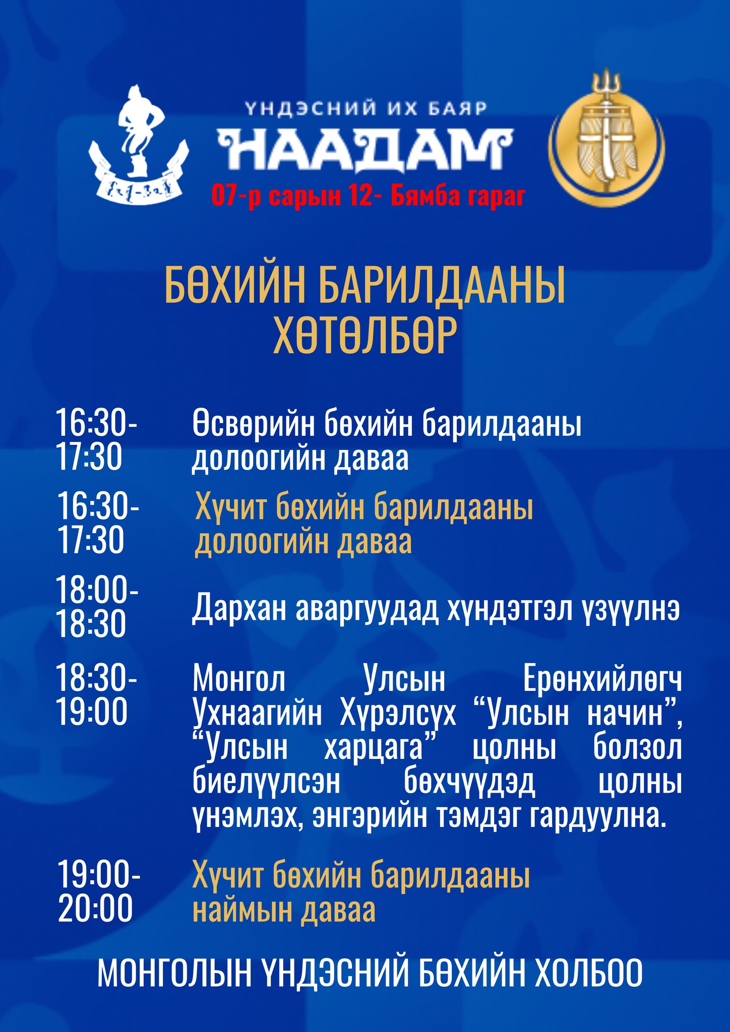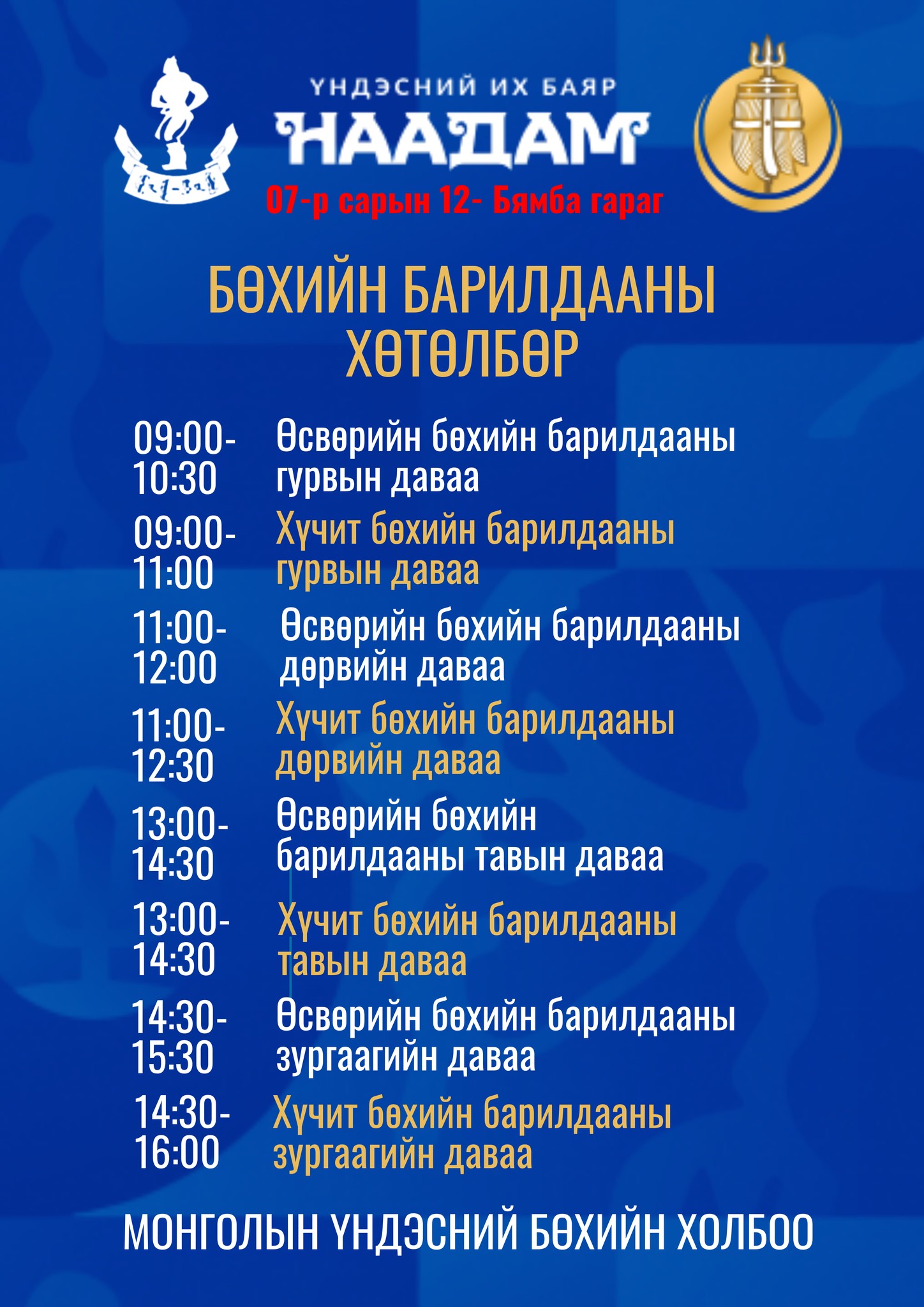 Үндэсний их баяр наадмын үндэсний бөхийн барилдаан Төв цэнгэлдэх хүрээлэнд долоодугаар сарын 11-12-ны өдрүүдэд болно. Тулгар төрийн төрийн 2234 жил, Их Монгол Улсын 819 жил, Тусгаар тогтнолоо сэргээн мандуулсны 114 жил, Ардын хувьсгалын 104 жилийн ойн үндэсний бөхийн барилдааны хуваарь гарлаа.