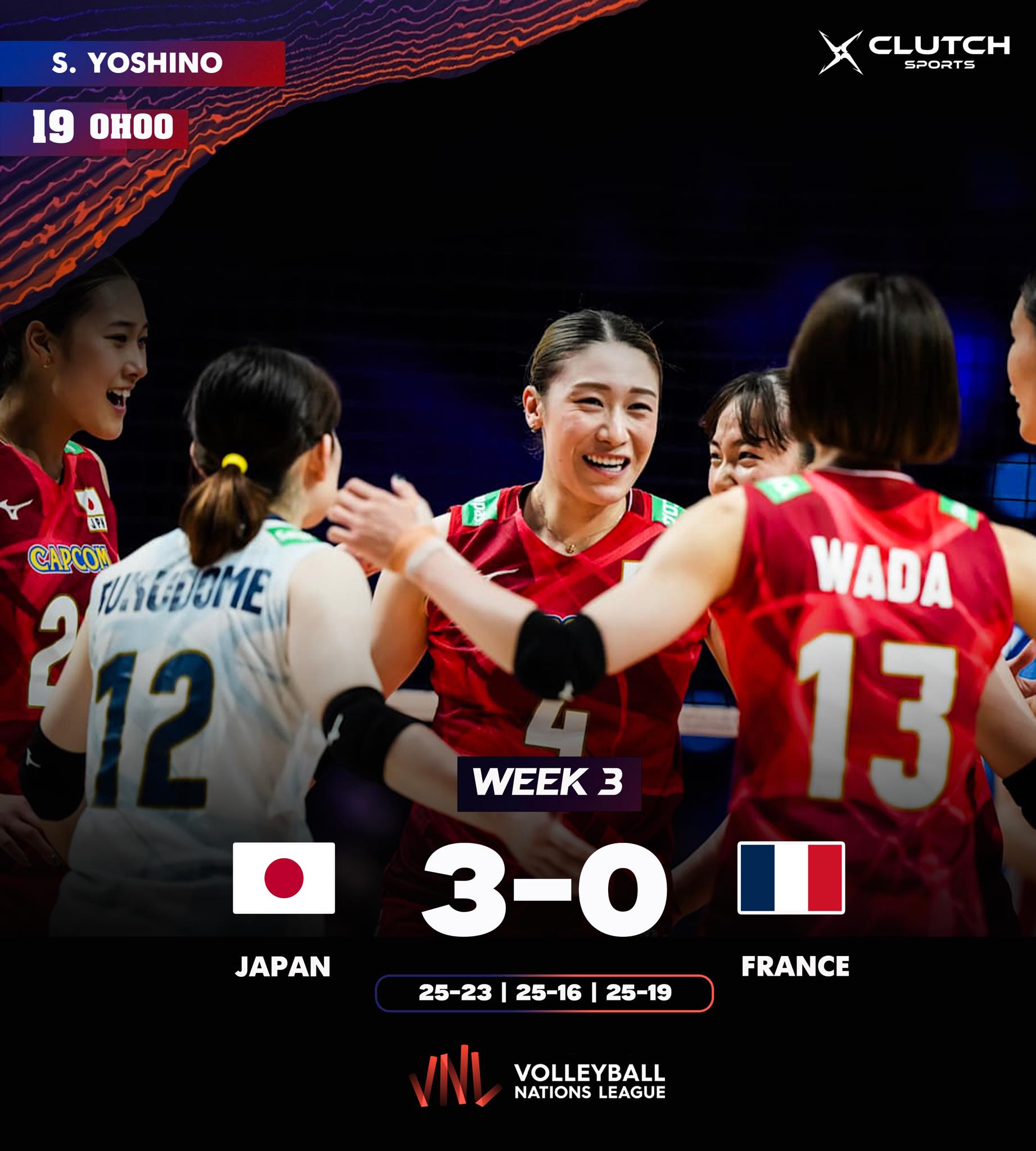 Волейболын “Nations league” лигийн тэмцээн үргэлжилж байна. Японы эмэгтэй шигшээ баг талбай дээрээ тойргийн эхний тоглолтоо Францын багийн эсрэг хийж 3-0 харьцаагаар хожил авлаа. Японы баг нэгдүгээр үед 25:23-аар, хоёрдугаар үед 25:16-аар, гуравдугаар үед 25:19-өөр Францын багийн хожиж, лигийн тэмцээний долоо дахь ялалтаа авлаа. Тус тоглолтод Японы багаас Yoshino 19 оноо, Ndiye 11 оноо, Ishikawa 9 оноо, Fangueduo11 оноо авсан байна.