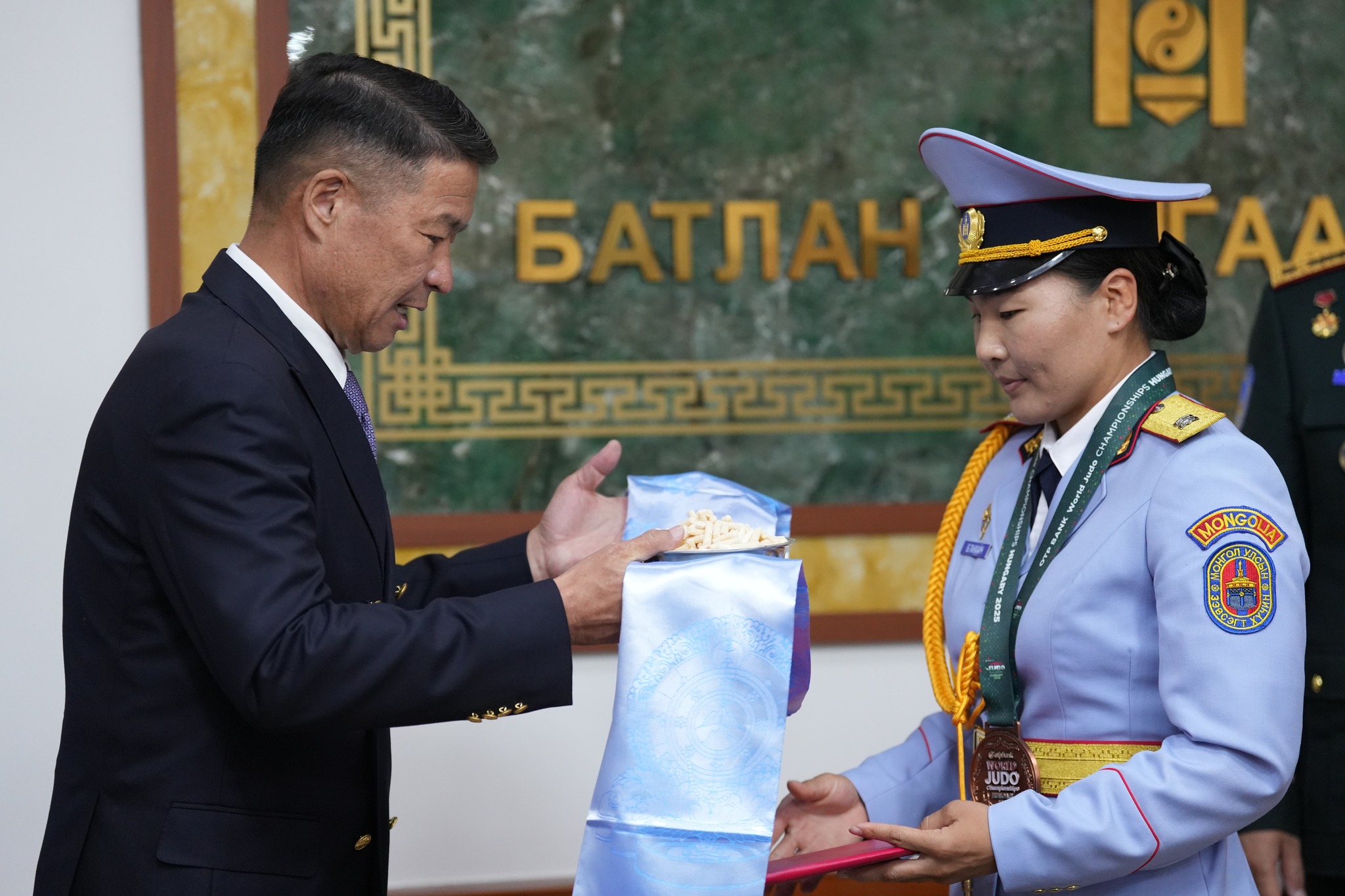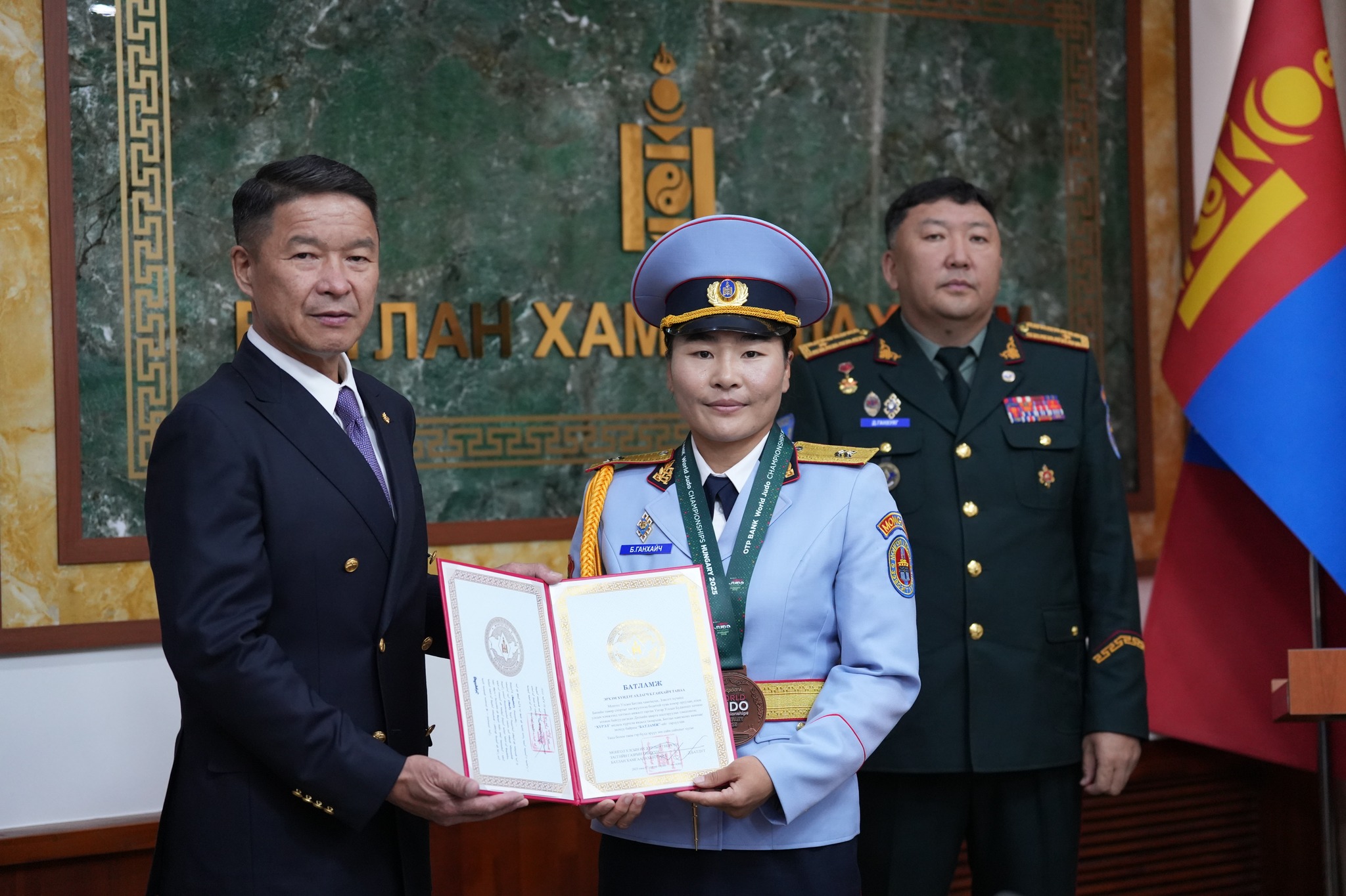 Монгол Улсын Батлан хамгаалахын яам, Унгар Улсад зохион байгуулагдсан жүдо бөхийн “Будапешт-2025” ДАШТ-ий хүрэл медальт, Ази тивийн аварга, “Душанбе-2025” их дуулгын аварга, Үндэсний шигшээ баг, “Алдар” спорт хорооны тамирчин ОУХМ Болдын Ганхайчид хүндэтгэл үзүүллээ. Өөрийгөө ялан дийлж, гэмтэл бэртэлтэй хүнд хэцүү цаг мөчийг ажралгүй даван туулж, эх орныхоо нэрийг өндөрт өргөсөн түүний гавьяа, хөдөлмөр зүтгэлийг үнэлж Монгол Улсын Батлан хамгаалахын яамнаас хоёр өрөө байрны батламжийг гардуулан өглөө.