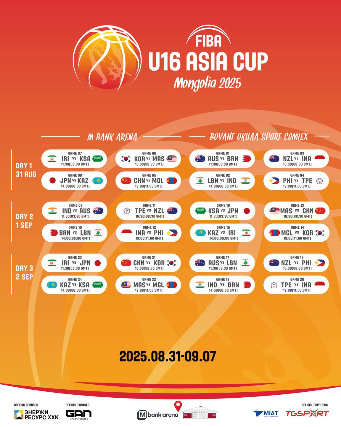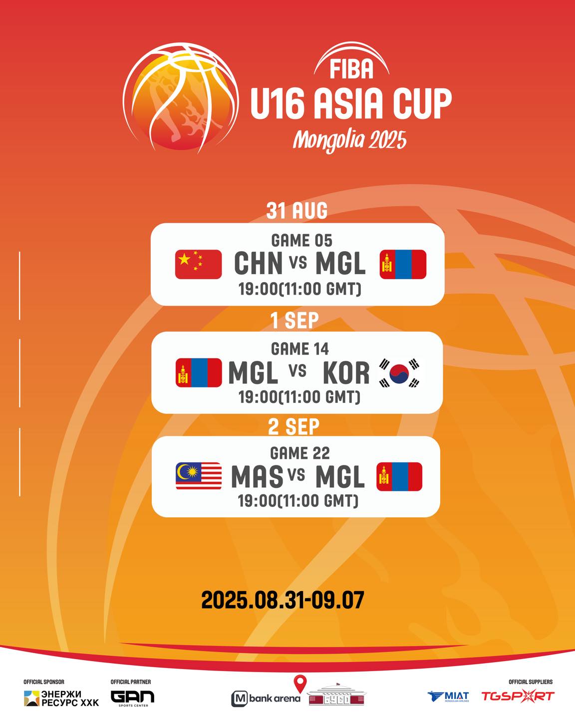 Монгол Улсын нийслэл Улаанбаатар хотноо сагсан бөмбөгийн “U16” ангиллын Ази тивийн аварга шалгаруулах тэмцээн болно. 2025 оны наймдугаар сарын 31-нээс есдүгээр сарын 7-ны өдрүүдэд” ФИБА U16” ангиллын Ази тивийн аварга шалгаруулах тэмцээн зохион байгуулагдана. Манай шигшээ багийн хэсгийн тоглолтуудын хуваарь гарсан байгаа. Тус тэмцээнд Азийн шилдэг 16 баг оролцох ба ирээдүйн сагсан бөмбөгийн дэлхийн одууд цуглах тэмцээн болно.