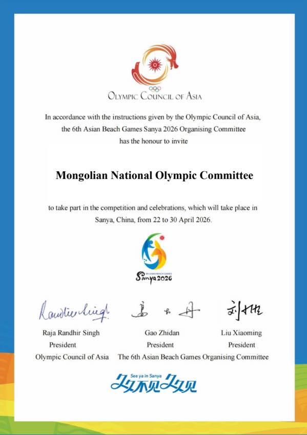 | МҮОХ-д "САНЬЯА 2026" Азийн элсний наадмын урилга ирлээ |