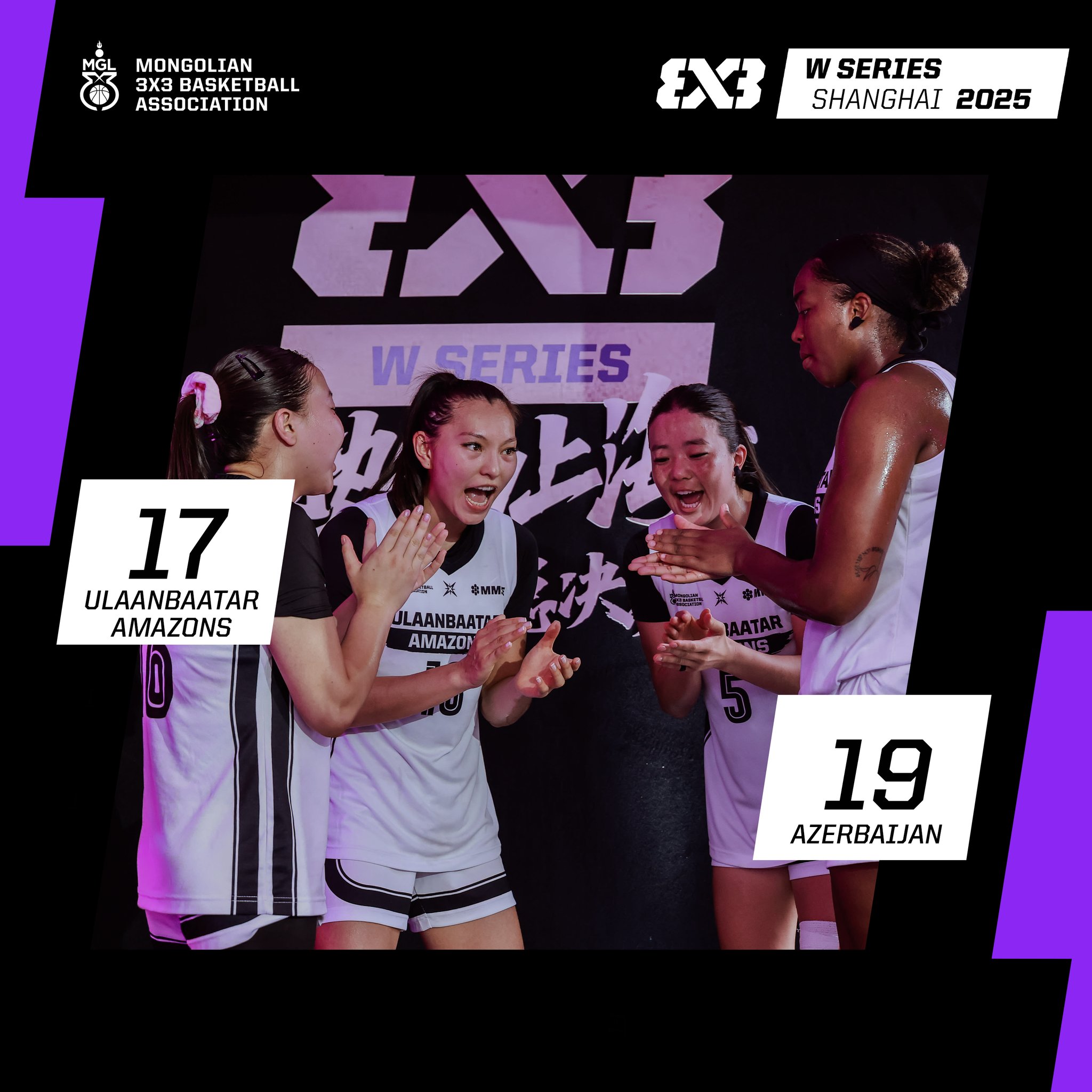 Хятадын Шанхай хотод болж буй сагсан бөмбөгийн “FIBA 3x3 Shanghai Women’s Series Finals” тэмцээний хасагдах шатны тоглолт боллоо. Тус тоглолтод “Ulaanbaatar Amazons” баг, Азербайжаны шигшээ багийн эсрэг хийж үндсэн цагт 17:17-оор тэнцэж, нэмэлт цагт 19:17-оор хожигдол хүлээж тэмцээнээ өндөрлүүллээ.